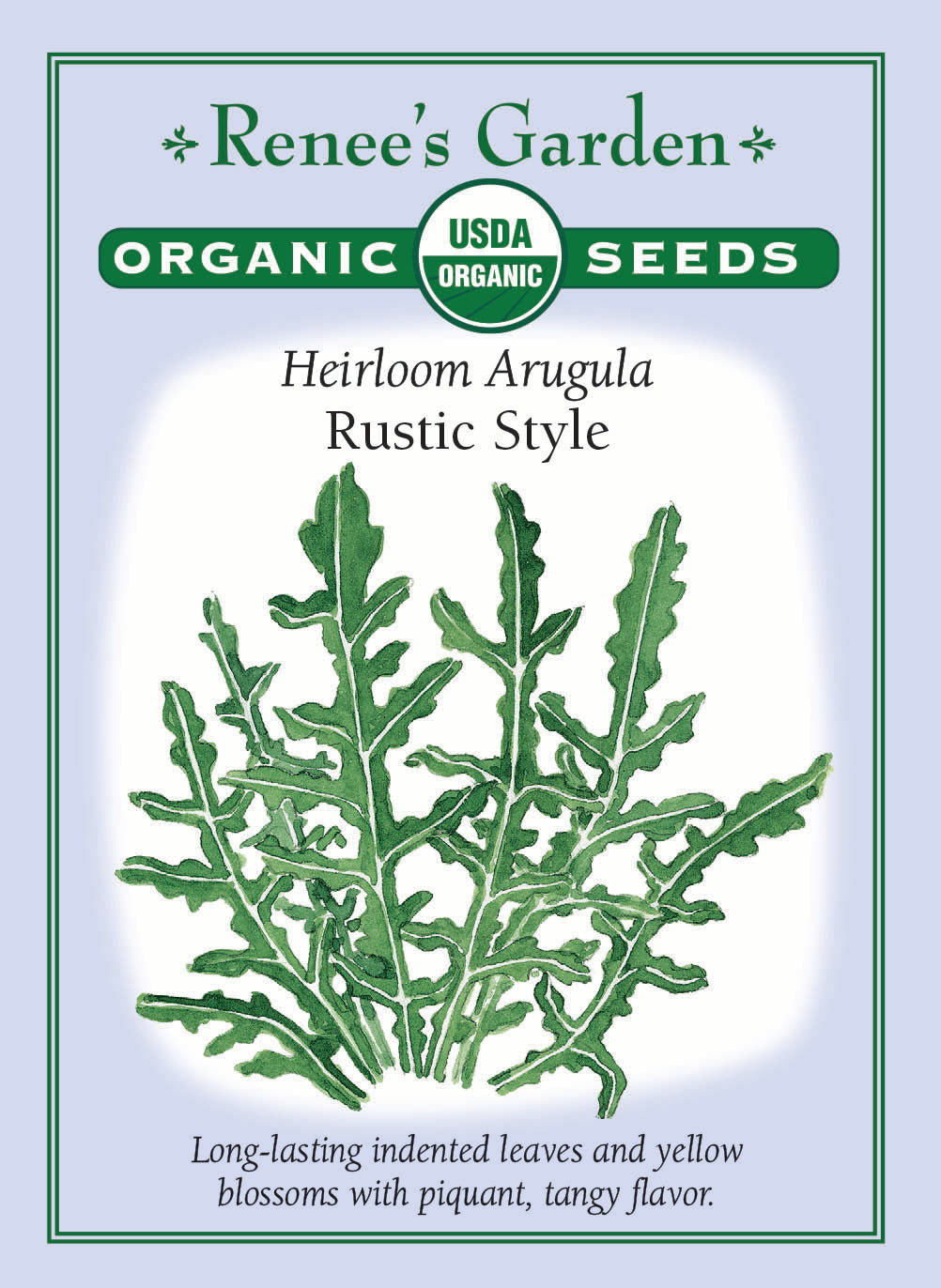 Long lasting rustic arugula stays leafy so you can harvest all season long from the same plants. Harvest individual leaves at 4 to 5 inches long, or cut bunches of young tender leaves as needed. Keep the little yellow blossoms pruned back for best leaf production or use for tangy edible flowers. Rustic will winter over in mild climates but make a fresh sowing each spring for best quality.