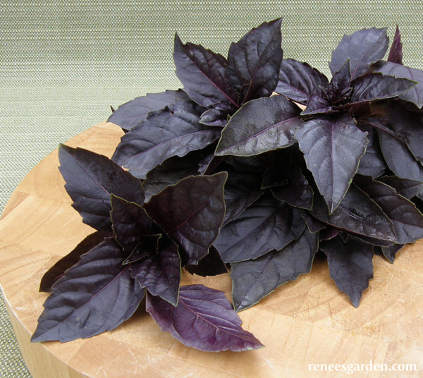 Excellent heirloom strain with beautiful garnet-purple leaves and pink flowers. Equally at home in vegetable, herb or ornamental flower beds and borders. A fragrant and striking addition for bouquets.