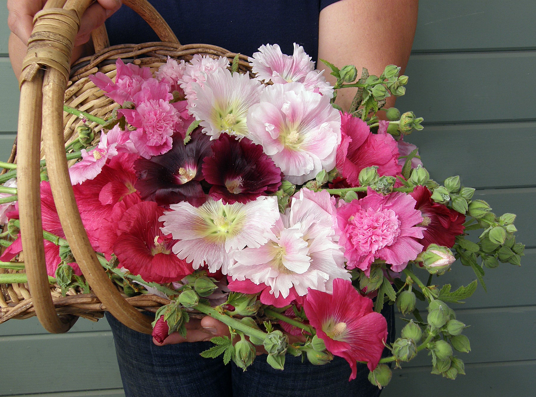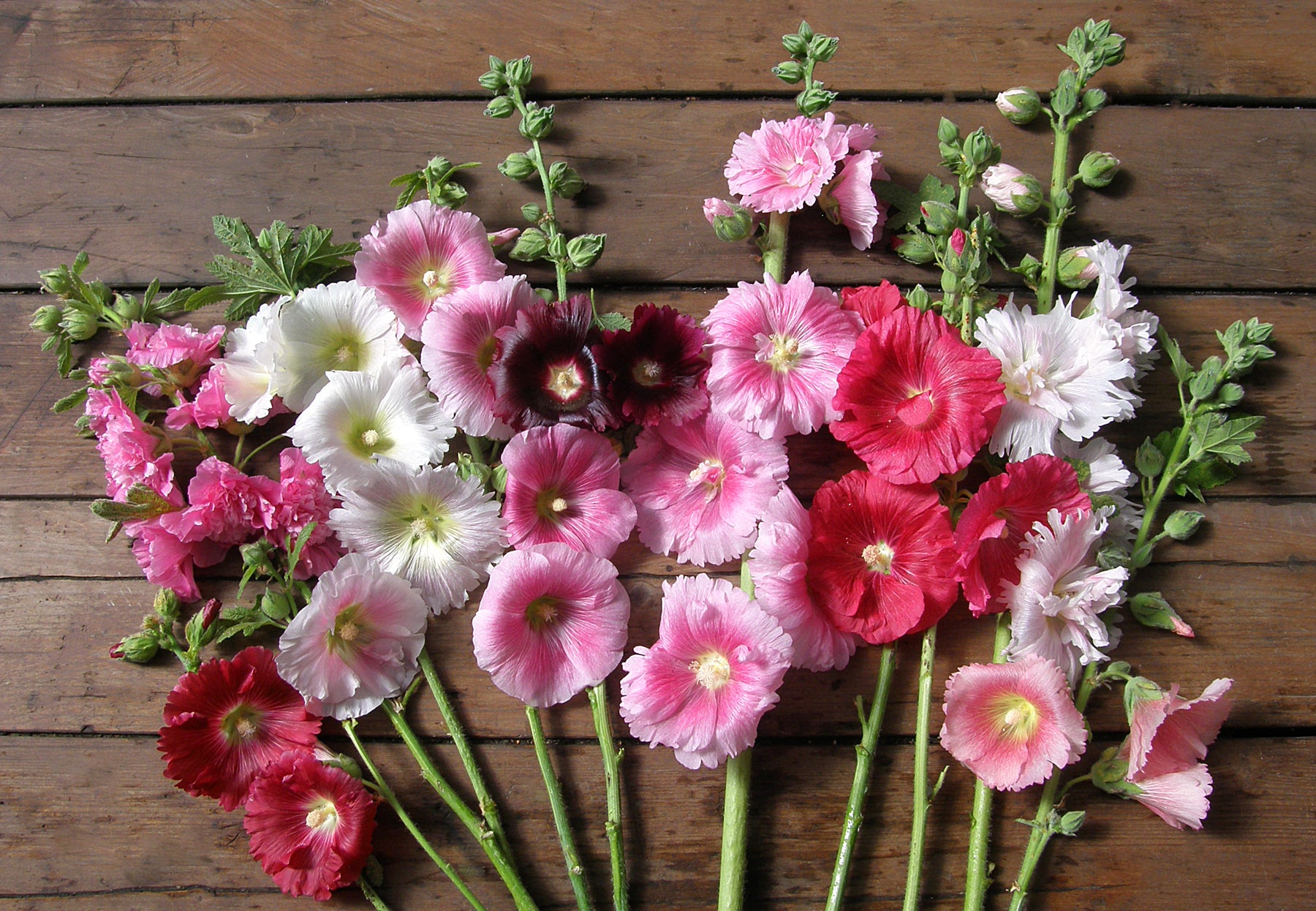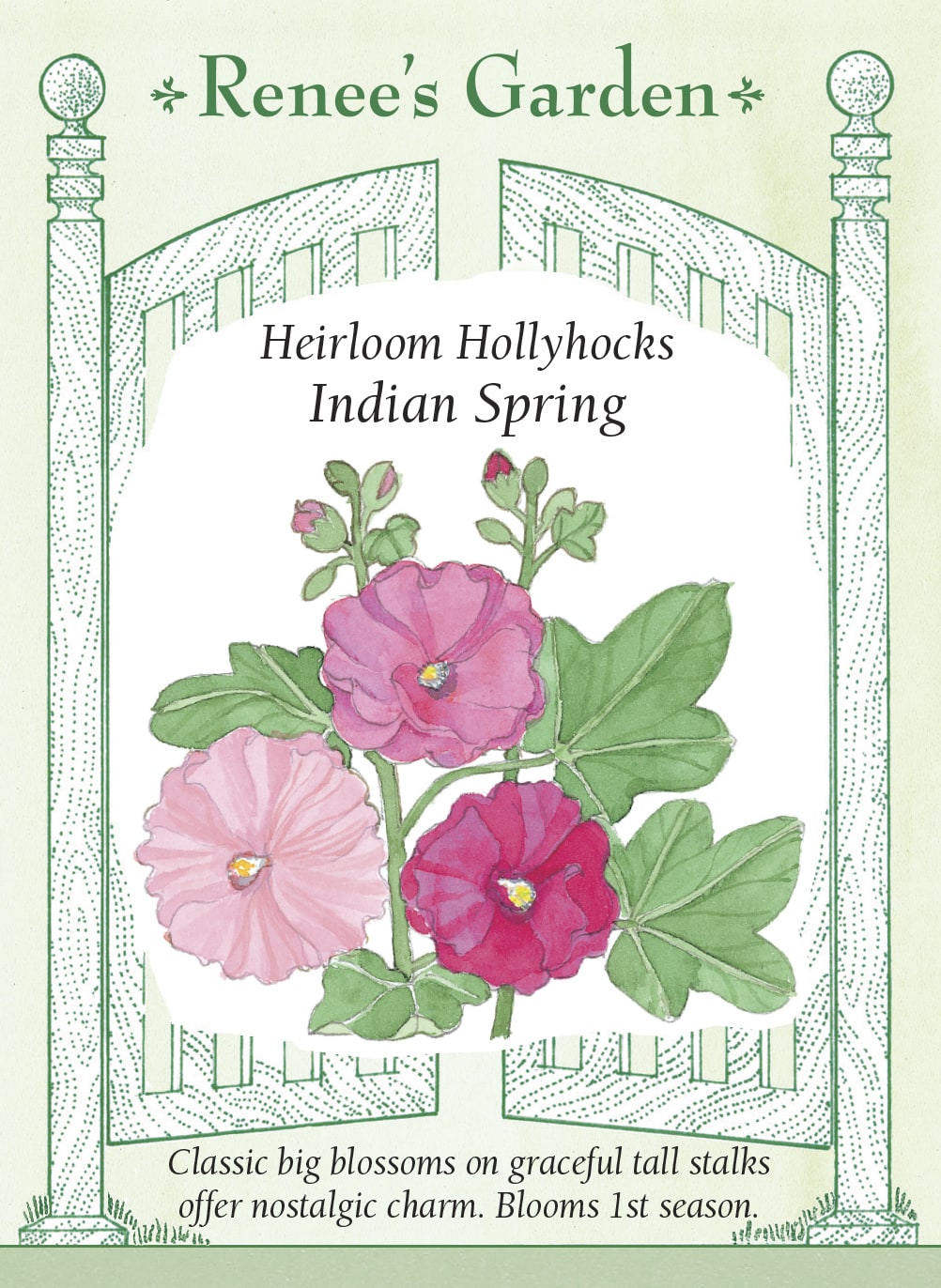 These antique hollyhocks provide old fashioned beauty to any country-style garden.The tall stems bear mostly single blossoms in classic hollyhock colors of deep rose, pink, salmon-pink, and white. Grow as a screen at the back of the garden and watch the towering spires of pointed buds slowly unfurl to reveal chalice-shaped flowers–the dancing gowns of flower garden fairies.