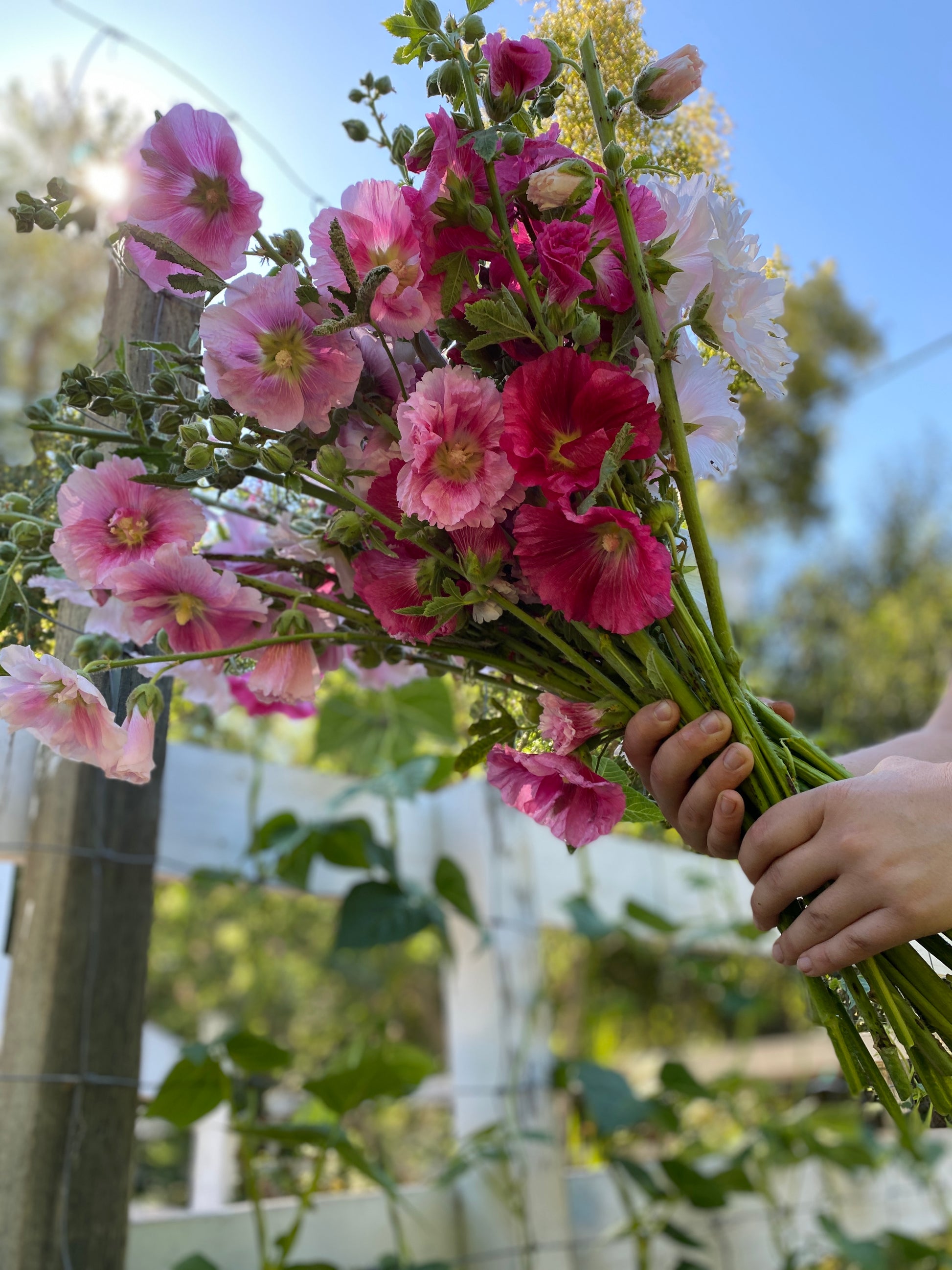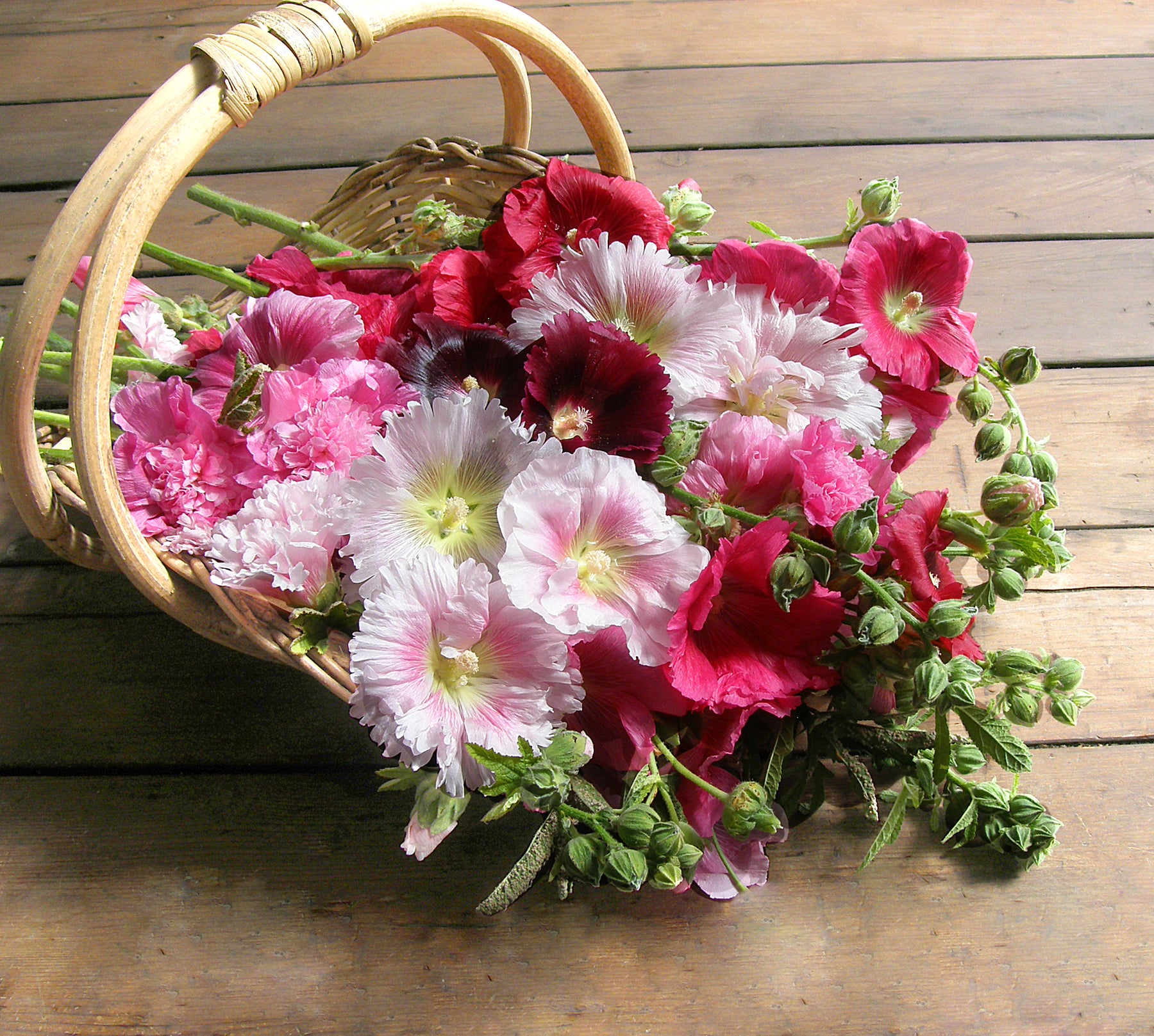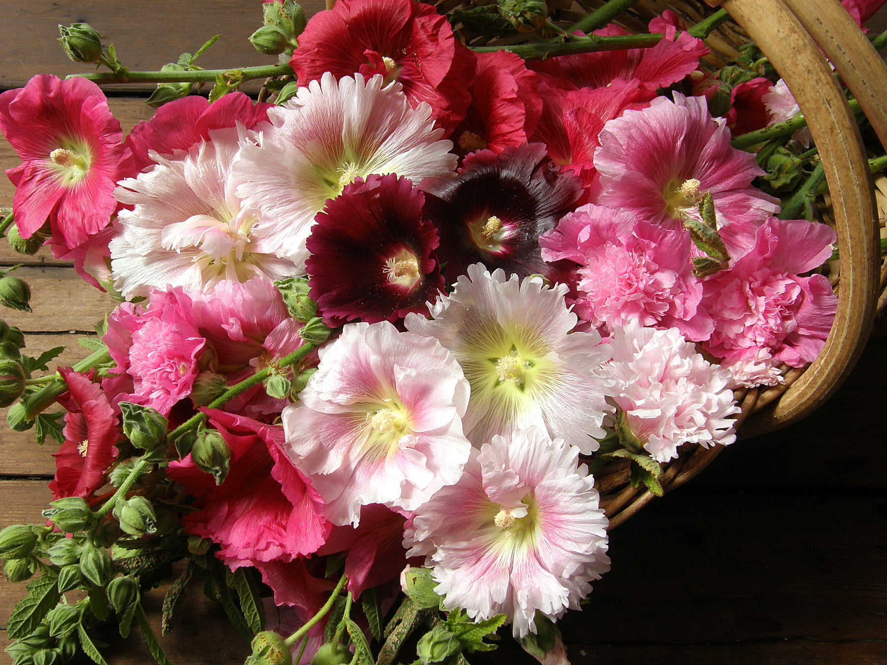 These antique hollyhocks provide old fashioned beauty to any country-style garden.The tall stems bear mostly single blossoms in classic hollyhock colors of deep rose, pink, salmon-pink, and white. Grow as a screen at the back of the garden and watch the towering spires of pointed buds slowly unfurl to reveal chalice-shaped flowers–the dancing gowns of flower garden fairies.