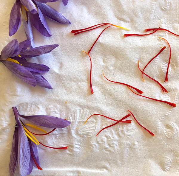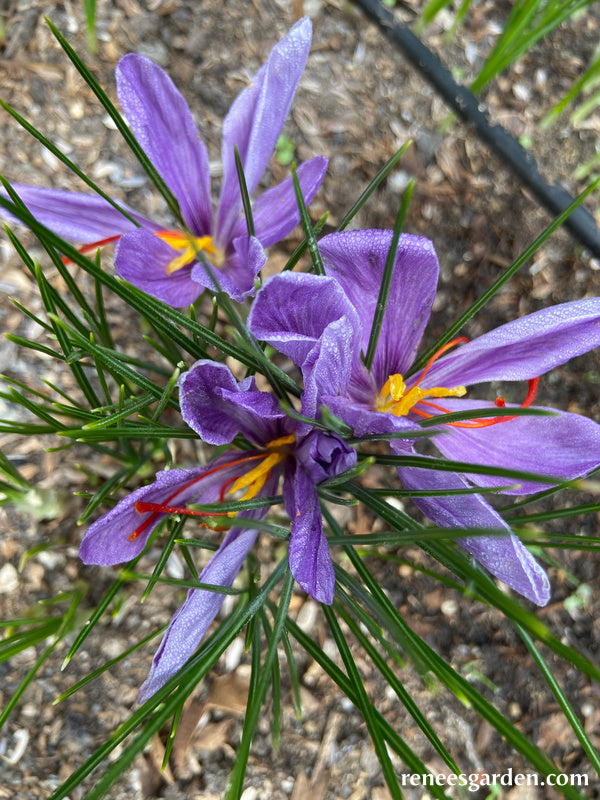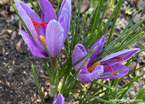 Fall planted Saffron crocus have rich, violet-purple blossoms with brilliant orange/red stigmas that are the source of the aromatic, exotic and pricey (!) culinary spice saffron. As the blossoms open, it’s super easy to collect and simply air dry the stigmas from the flowers for your own fresh, first quality, intensely flavored saffron “threads” for cooking. Easily grown in the garden or containers.