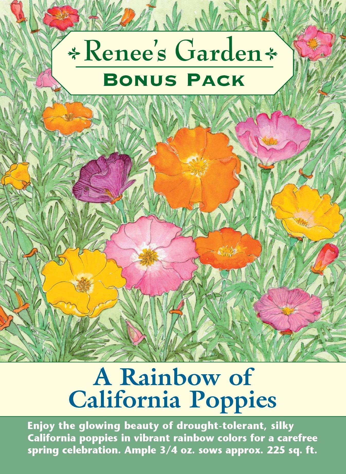 Easy to grow, cheerful California poppies in this rainbow mix of soft pink, magenta–rose, yellow, gold and classic orange are a perfect choice for hot and dry areas and grow without fuss all over the country. The satiny blossoms shine above mounds of feathery gray-green foliage for weeks, covering the ground with a cloak of bright, fluted flowers. Sow these poppies to cover a neglected area or hard to cultivate slope, or plant in a large garden area for a memorable display.