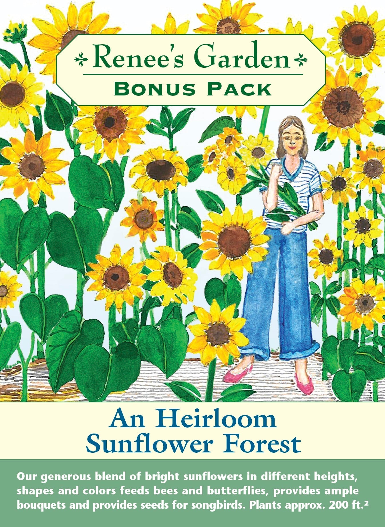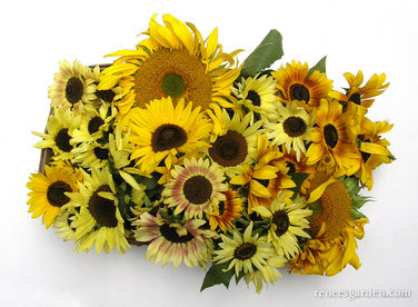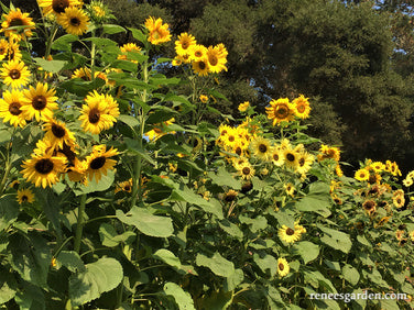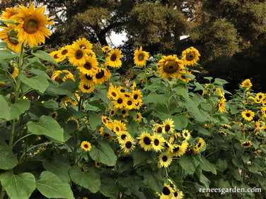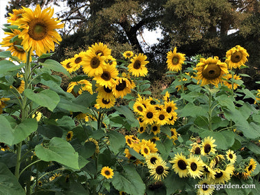 Our own blend of tall, large flowering single sunflowers that grow like sunny beacons, mixed with slightly shorter, branching sunflowers that offer clusters of bright flower faces in many color combinations. The effect is literally like a forest with flower faces of all heights, shapes and colors.
