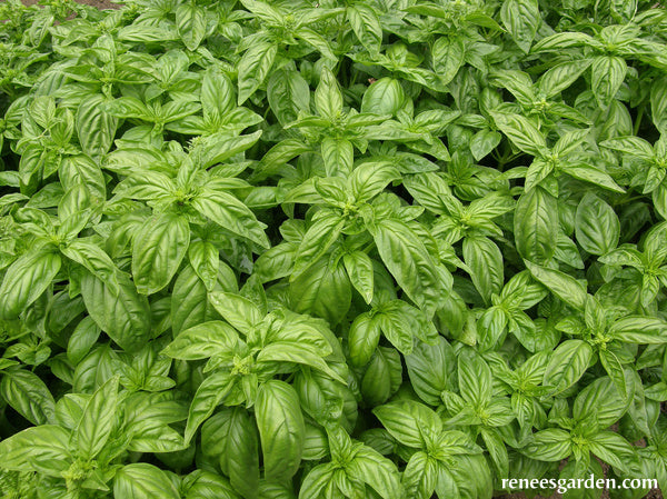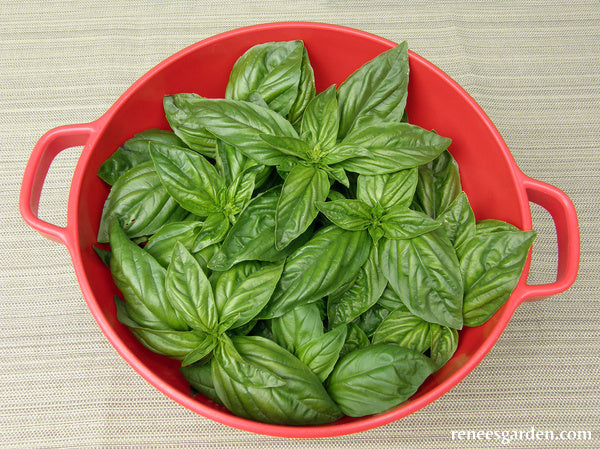 It is critical to sow seed or transplant basil seedlings only when late spring day and nighttime temperatures stay above 55°F (13°C). Harvest sprays of leaves by snipping stems just above two new sprouting lateral branches to encourage lush foliage. Keep flower buds pinched off to extend harvesting. Feed regularly with high nitrogen fertilizer after harvesting to promote new growth. Except in very short season areas, make a second planting three weeks after the first for a continued supply of fresh, aromatic leaves.