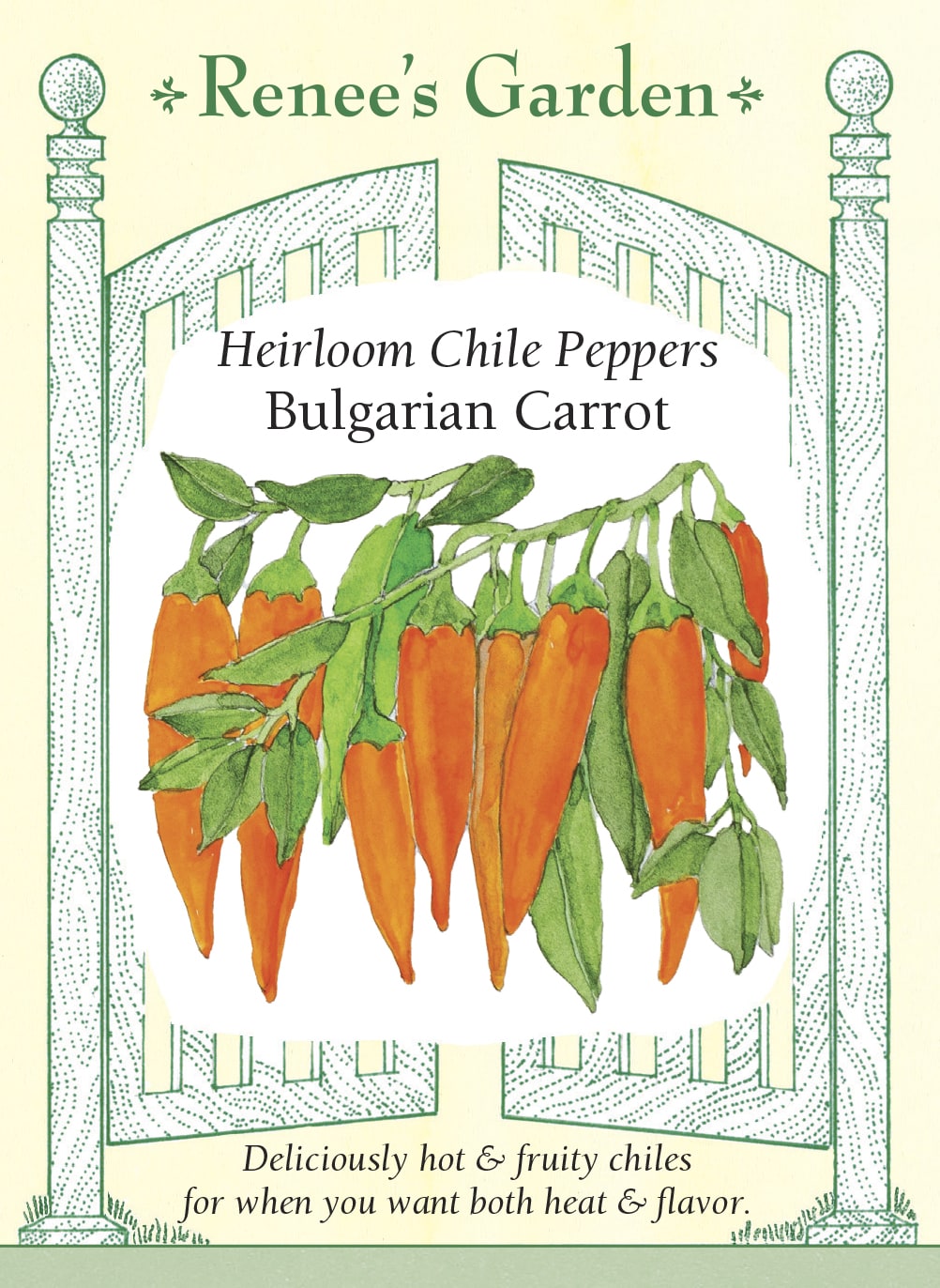 Also known as “Shipkas,” these compact heirloom chiles bear heavy sets of early maturing, 3 inch glossy orange pods shaped like little carrots. Bulgarian Carrot chiles are both hot and fruity and really delicious in fresh salsas, for scrumptious sauce, or any dish or sauce that calls for both heat and lots of flavor. Their thicker, crunchy walls are perfect for hot pickled peppers. Carrot chiles rank between Jalapenos and Cayennes in heat levels.