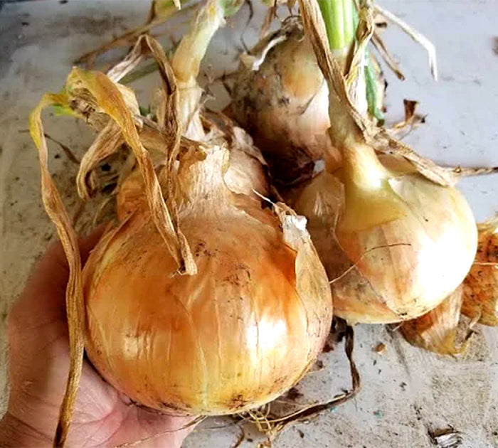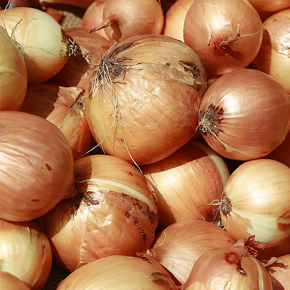 This handsome, bronze-skinned hybrid onion grows successfully just about all over the country and it's the perfect onion to try if you haven't grown them before. All-purpose Candy produces big, softball sized, globe-shaped onions, with a mild onion flavor and firm crispy yellow flesh that is delicious raw or cooked. Candy onions caramelize beautifully when chopped and sautéed.