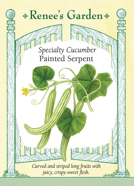 Enjoy long harvests of cool cucumber-like fruits all season! Originally from Armenia, these long, curvy fruits are not a true cucumber but a melon. The crispy, white flesh is never bitter and the pretty striped skins do not need peeling. Painted Serpent thrives in hot and humid weather, yielding consistent large harvests of 10-12 inch long, deliciously juicy fruits to enjoy fresh from the vine. Cut into decorative scalloped slices, they are pretty as a picture!