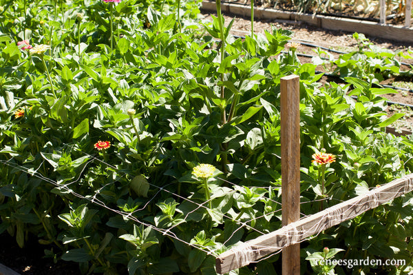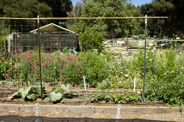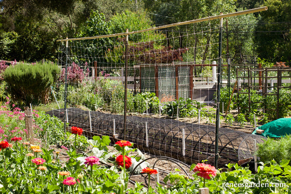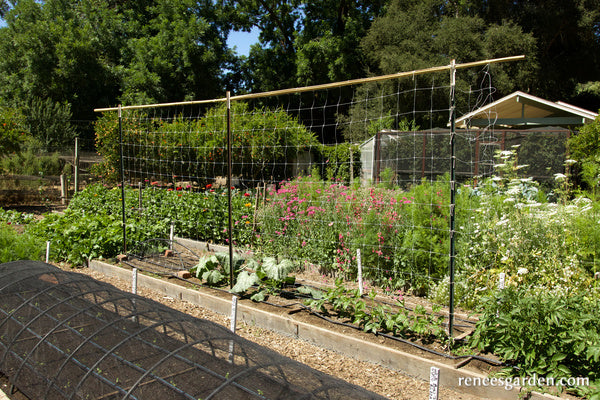 Growing vining/climbing vegetables and flowers requires a good plant support system. We use and recommend this sturdy, lightweight and reusable polypropylene trellis. It supports climbing flowers and vining vegetables both horizontally and vertically. Made in Italy, this durable, strong UV resistant netting allows air to circulate freely and its big squares are easy to reach through and harvest on both sides.