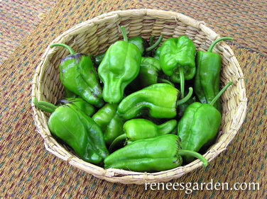 For traditional Tapas, harvest the abundant little pointed fruits at no more than 2 inches long. At this small size, they are fragrant and flavorful; larger fruits get very spicy. To serve: Sauté the Tapas peppers quickly in a little hot olive oil just until the skins are glossy and slightly charred. To finish, sprinkle with coarse salt and enjoy while still hot. Most Padrons are mild, but occasionally one little pepper will have more spice — this is traditional and even sought after in Spain.
