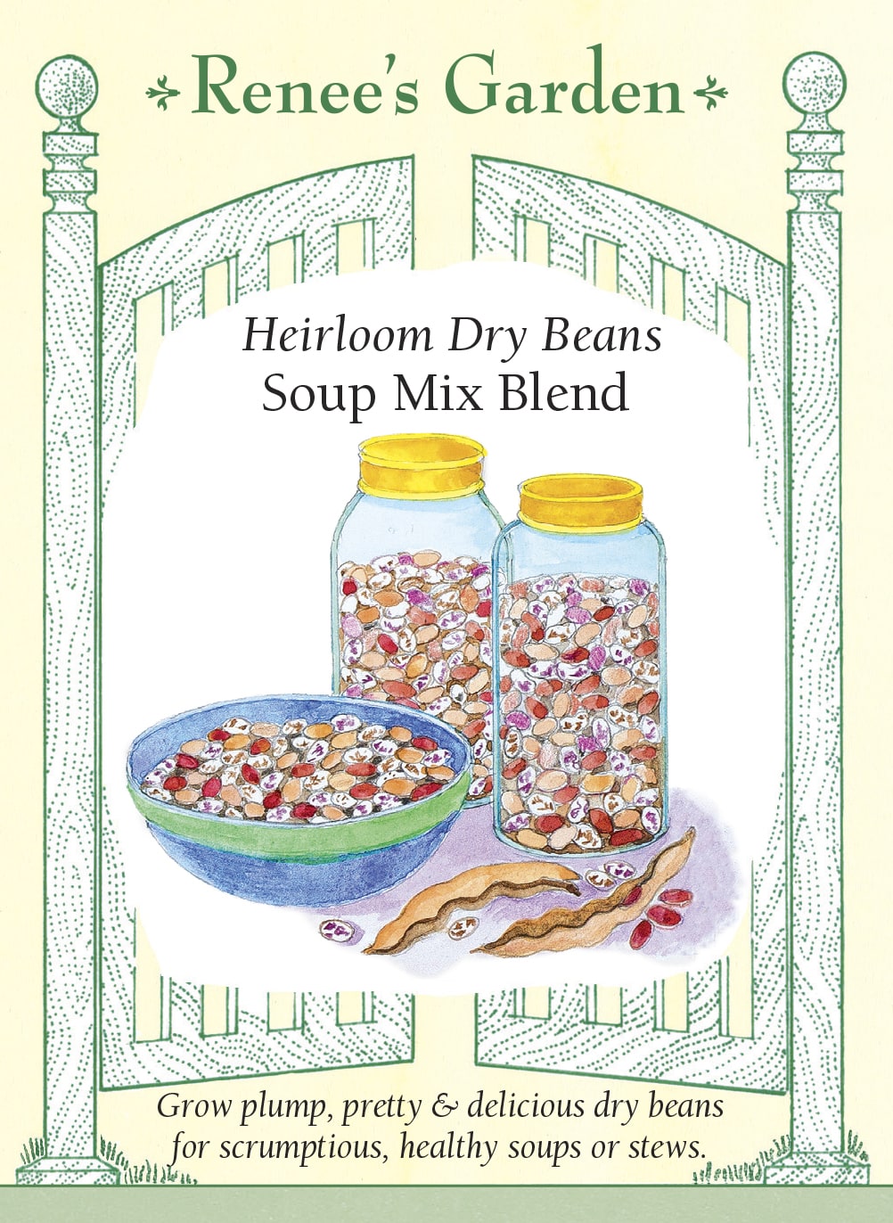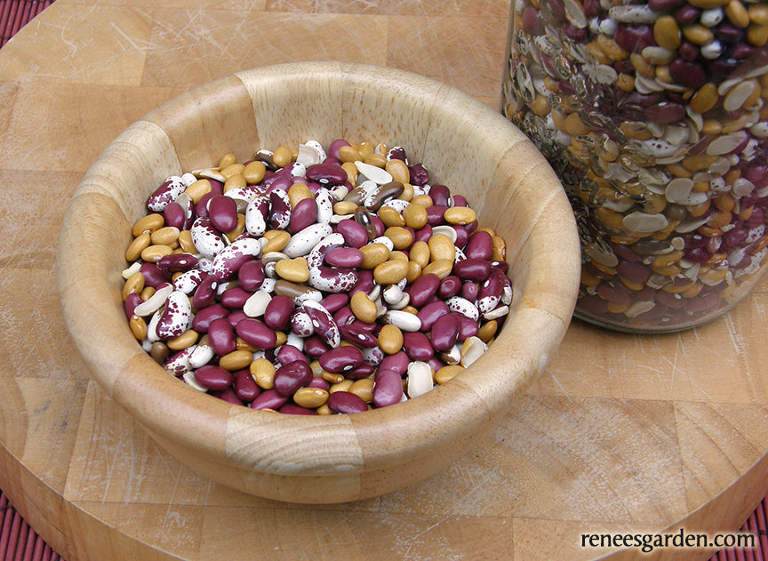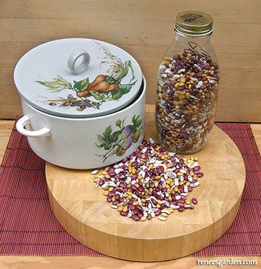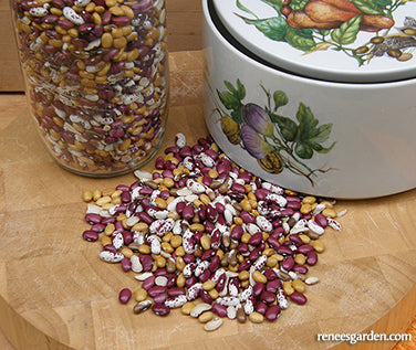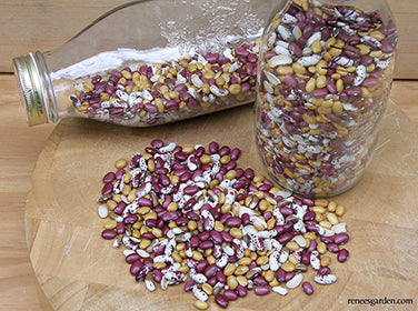 Our blend of colorful, tasty, heirloom bush beans specially selected to grow and harvest as a colorful mix from one garden bed. Expect big yields of plump dry beans that taste nutty, creamy and meaty when cooked, much superior to older, tougher store-bought beans. Make delicious, hearty, nutritious soups, stews, chili and casseroles throughout the colder months with just the addition of onion garlic and a few dried herbs. True garden treasure!