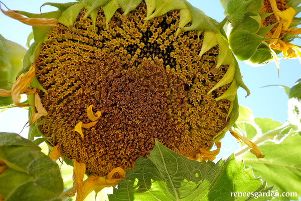 To harvest for feeding birds in fall and winter: cover heads with paper bags till ripened kernels are plump and hard-shelled, then cut entire heads, let them fully dry. Remove the seeds by hand into a basket, then blow off loose chaff. Store in closed containers to feed as needed.