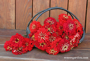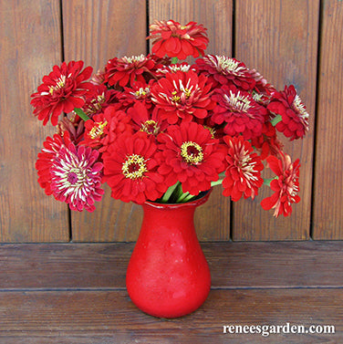 EXCLUSIVE - Our own sizzling hot blend of cutting zinnias in bright scarlet, rich true crimson and deep dark red, all knockout red shades that enhance and augment each other for gorgeous bright garden color and absolutely stunning centerpiece bouquets. You will love the fully double, big flowers that bloom strongly on vigorous, branching 3 to 3 1/2 foot tall plants. These stunning and long-lasting red flowers are guaranteed to attract native pollinators, butterflies and hummingbirds to your garden.