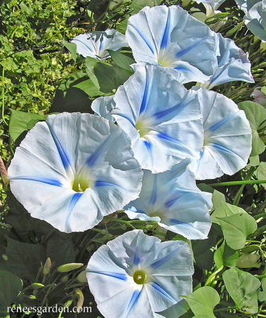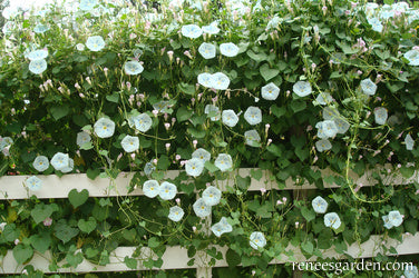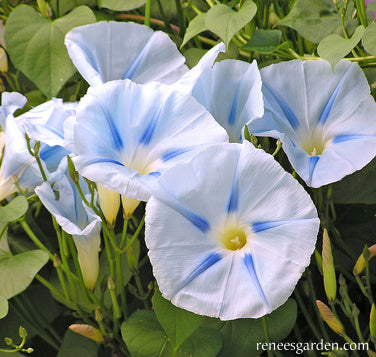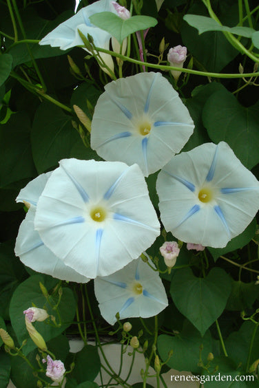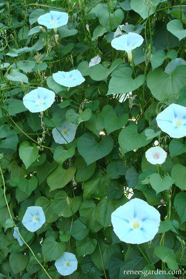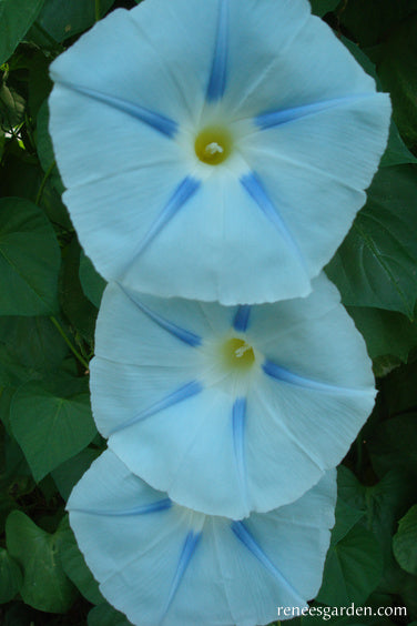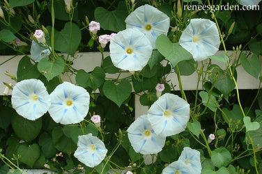 Erect well-anchored supports at least 8 feet tall at planting time; strong netting or a sturdy trellis serve well to hold these vigorous climbers. Flowers begin in midsummer, once days begin to shorten. Morning glories will bloom hard until the sun is strong each day; longer on cloudy days. Combine with climbing Moonlight nasturtiums or Purple Hyacinth beans for a striking show of iridescent beauty.