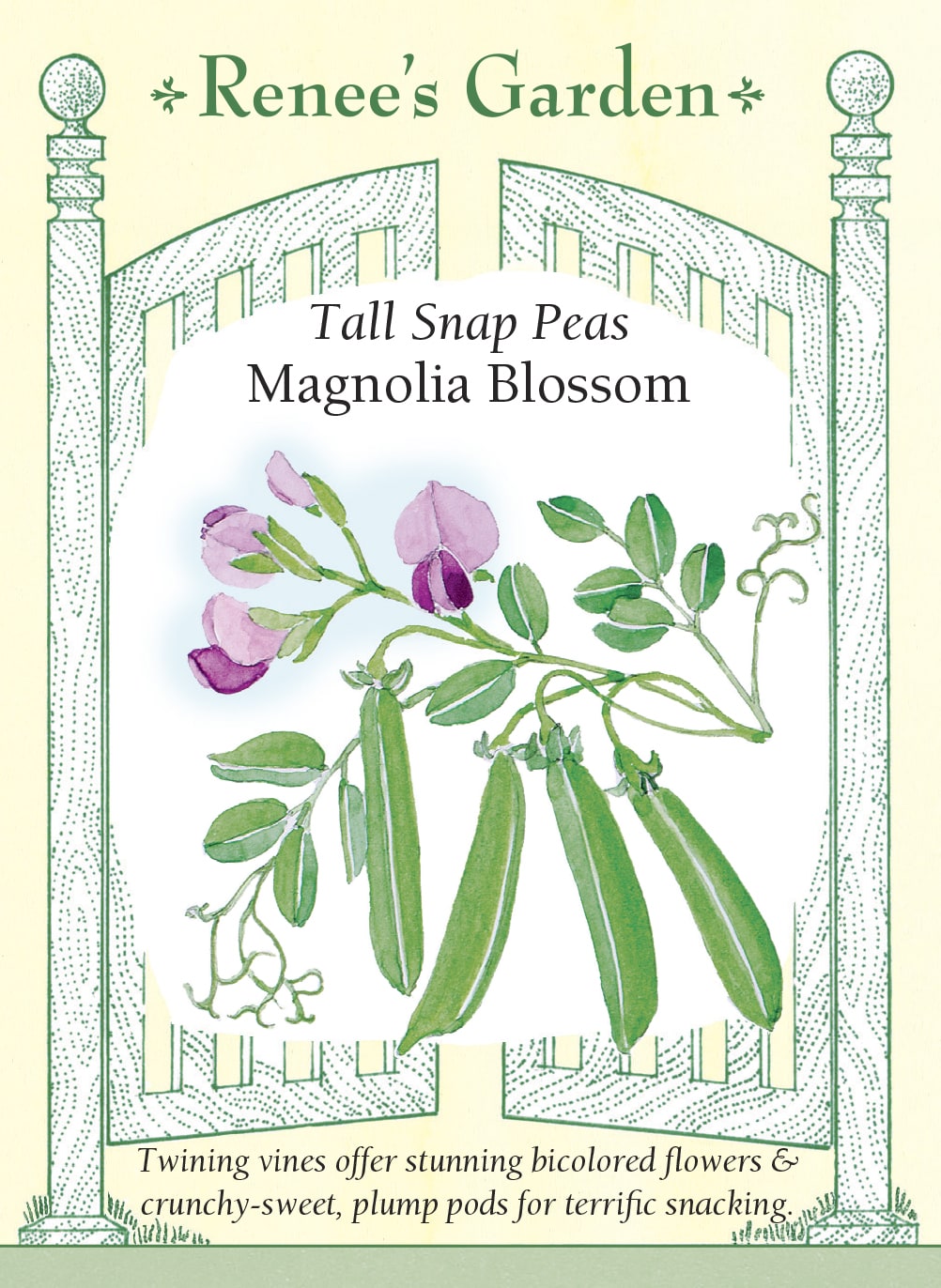 This highly productive, 5-8 foot tall vining snap pea has eye-catching bicolored purple blossoms that really shine in the garden. These pretty flowers are soon followed by an abundance of well filled, crunchy-sweet, plump pods. Keep the succulent pods picked (they are delicious right off the vine) and the vines will keep producing pods over a long harvest season. Sow again mid to late summer for fall harvest. Magnolia Blossom vines easily twine up any vertical supports making it quick and easy to harvest them.