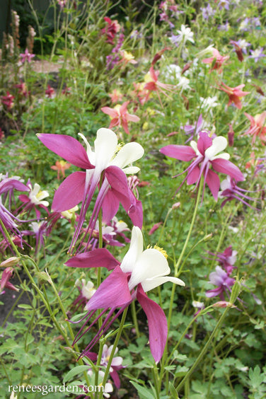 EXCLUSIVE – We import Mrs. Scott Elliot Columbine from France, where an old firm still grows seed for these old-fashioned beauties. Their large elegant blossoms sway on wand-like stems above a cloud of lacy scalloped green foliage. The intricate flowers with their long graceful spurs are quite magical as they dance in combinations of white with pink, dark lavender, yellow, rose, claret and pale blue. Mrs. Scott Elliot is one of my favorite joys of spring and hummingbirds love them too!
