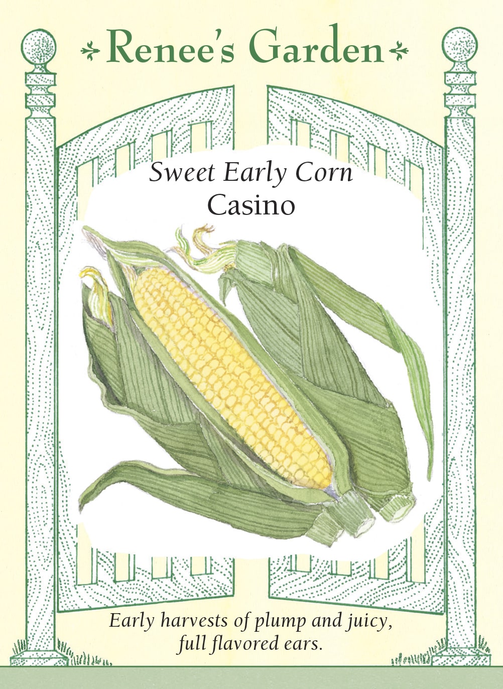 There is no need to isolate Casino from other varieties, but plant seeds in blocks of at least 4 parallel rows to ensure good wind pollination and well filled out ears. Corn is a heavy feeder, so add plenty of compost or aged manure to the soil at sowing time, and then fertilize when young plants are 7 or 8 inches tall and again as ears begin to form.