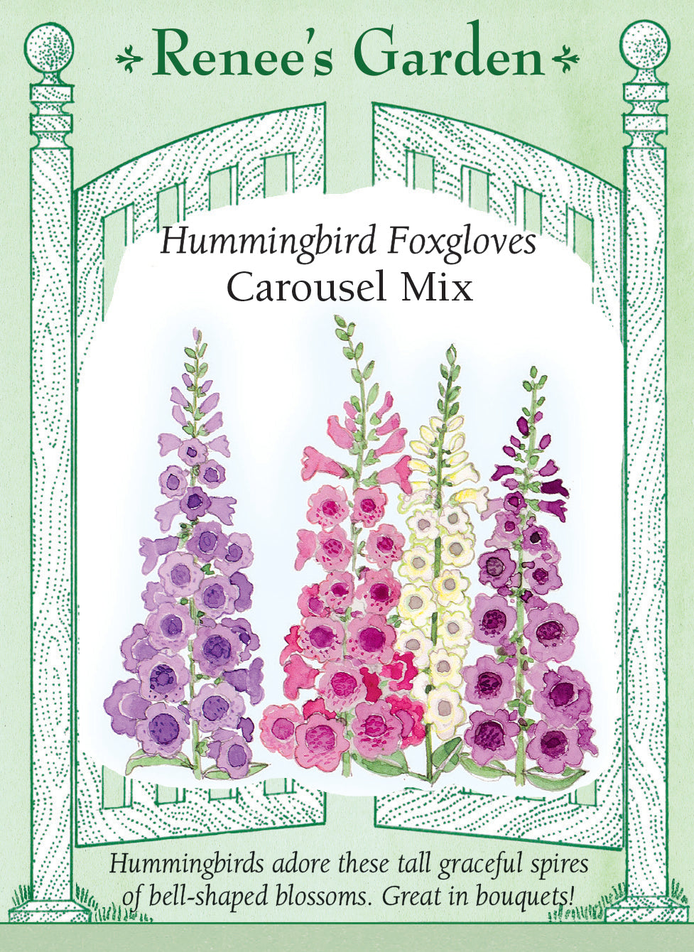 Our lovely English foxglove selection bears 3 - 3 1/2 foot tall sturdy spikes of densely packed, soft, bell-shaped flowers in pastel shades with freckled throats. Hummingbirds, bumblebees and butterflies love to visit these deer resistant plants. Sown in early spring, Carousel will bloom the first year from seed; sow midsummer for bloom the following spring. Mature plants usually self-sow to produce future generations. New seedlings can be easily moved in their first season.