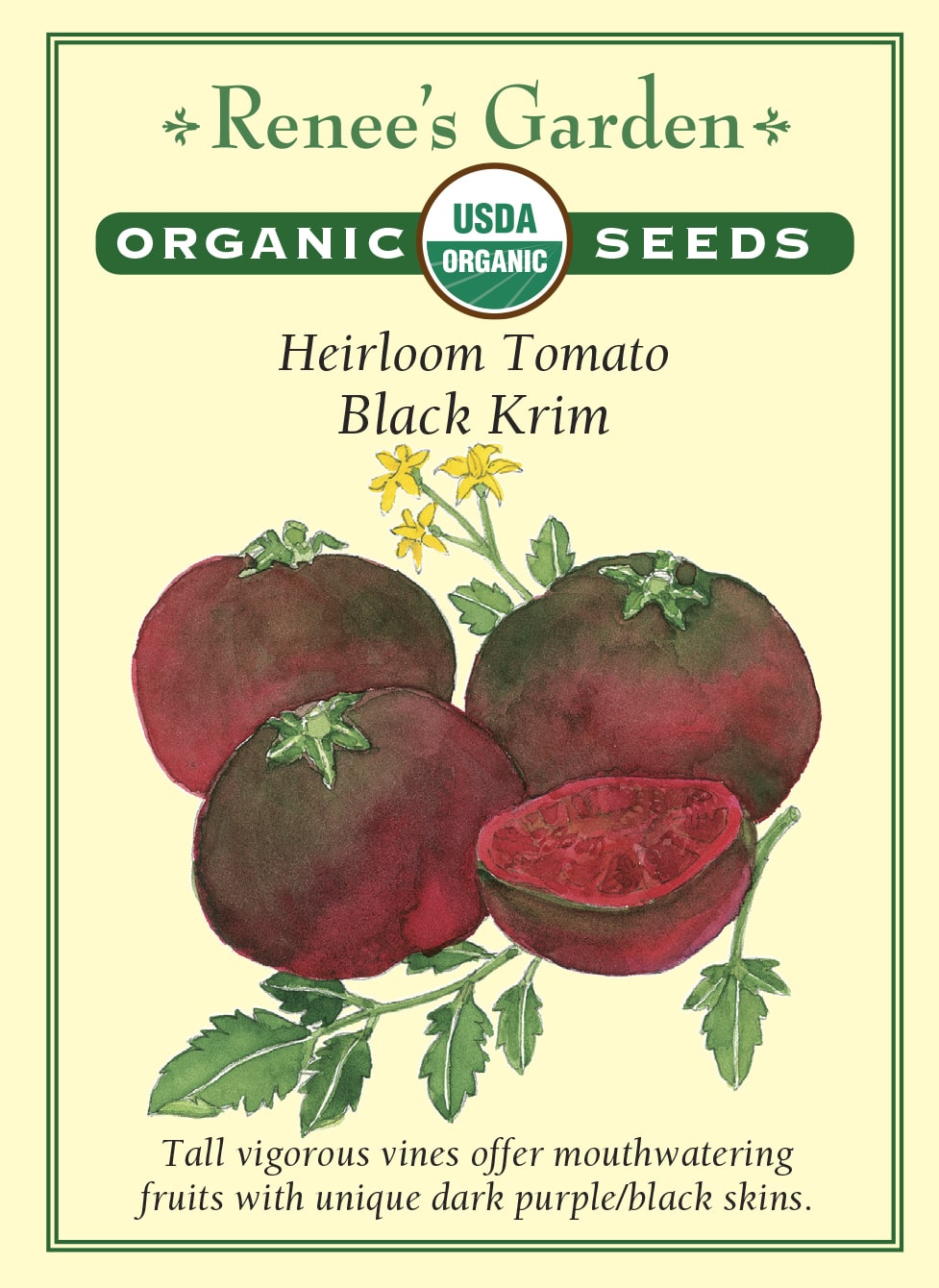 Heirloom whose big leafy vines produce lots of slightly lobed deep purple/black fruits whose juicy rich red flesh offers sweet and delicious flavor.
