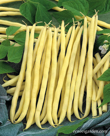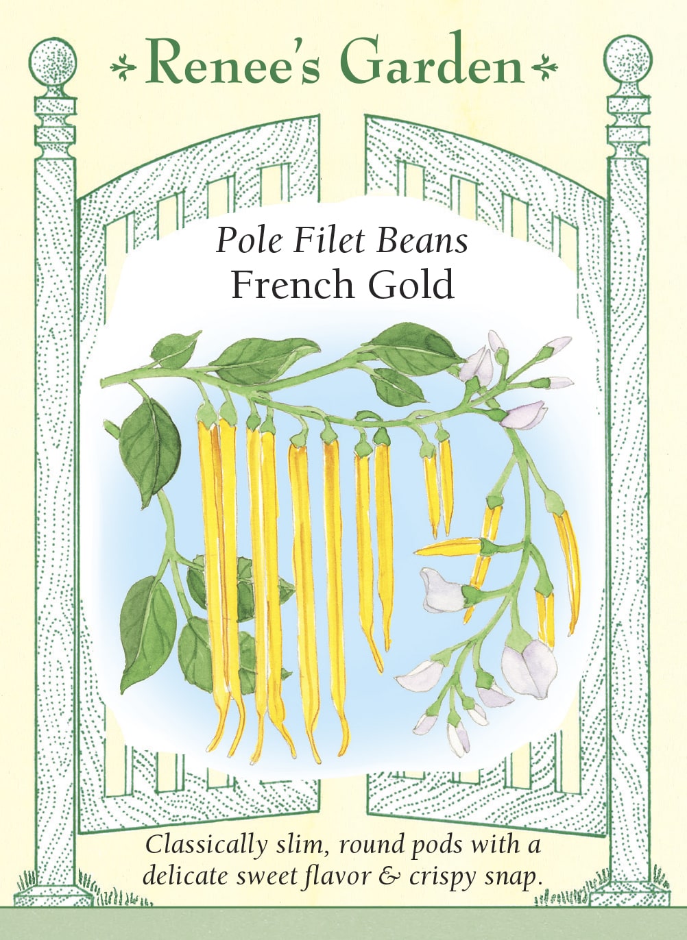 These hard-to-find, handsome yellow filet pole beans were originally bred by our favorite French seedmen for their domestic market. French Gold are true “haricot verts” beans: classically slim, round 7 to 9 inch pods with delicate, sweet flavor and a crispy snap that makes them especially choice eating. The heavy bearing, vigorous vines yield extra-fancy, juicy pods to enjoy in colorful summer meals over a long season of harvest.