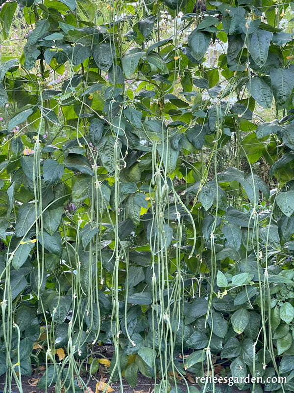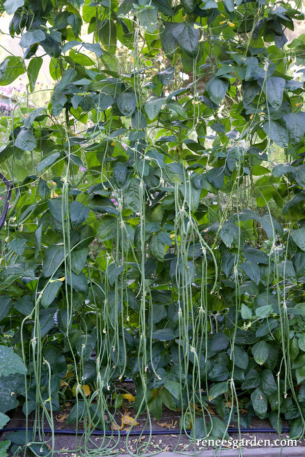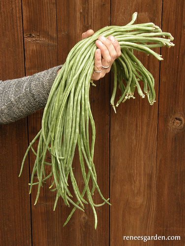 For the best yields, pick beans frequently, at least every 2 or 3 days. Harvest these astonishingly long, crispy pods when beans are still pencil thin, the pods snap when bent & before the seeds have filled out inside; generally when about 12 to 18 inches long. If the pods get too thick & bulky, they will be fibrous & tough.
