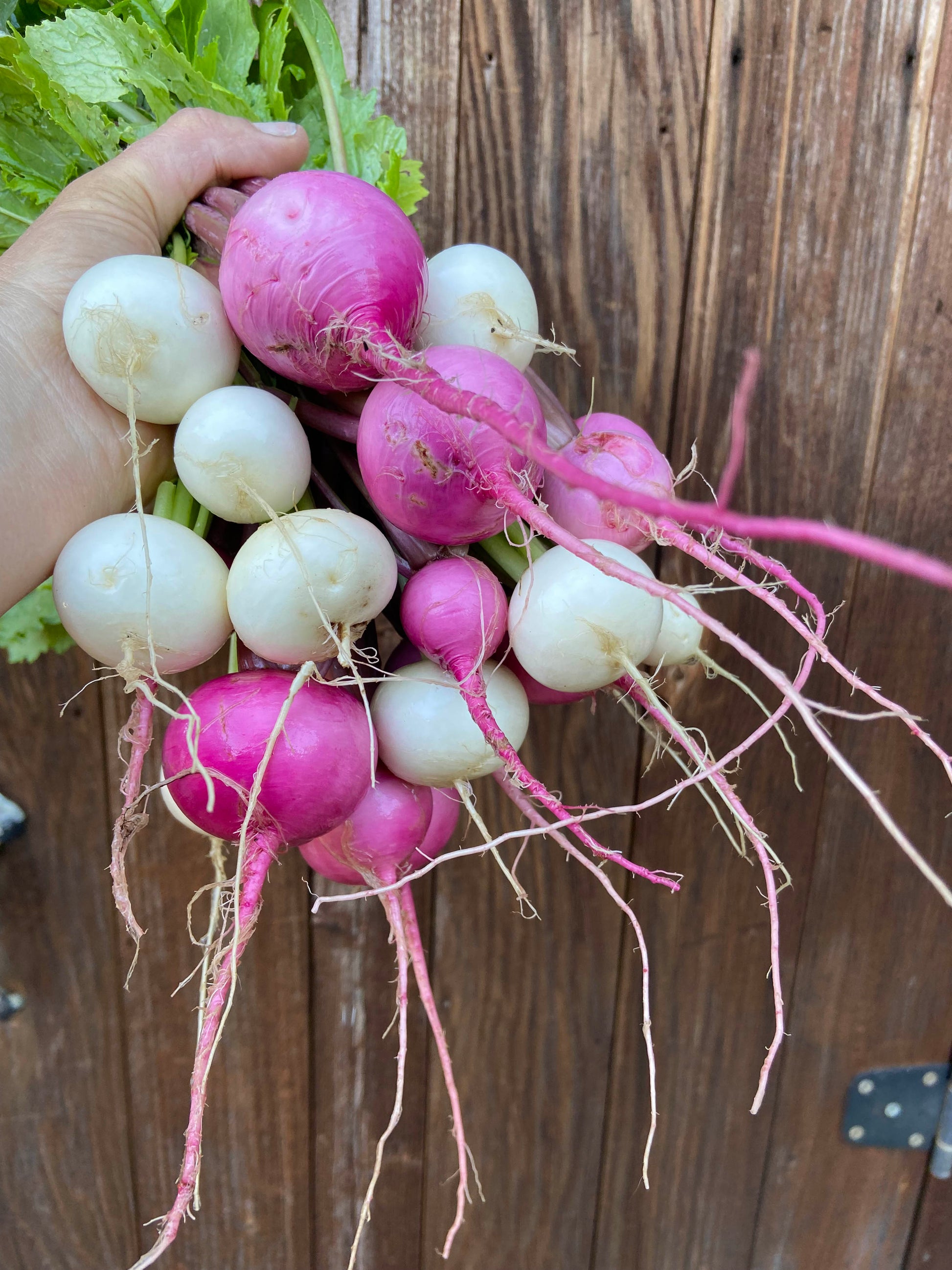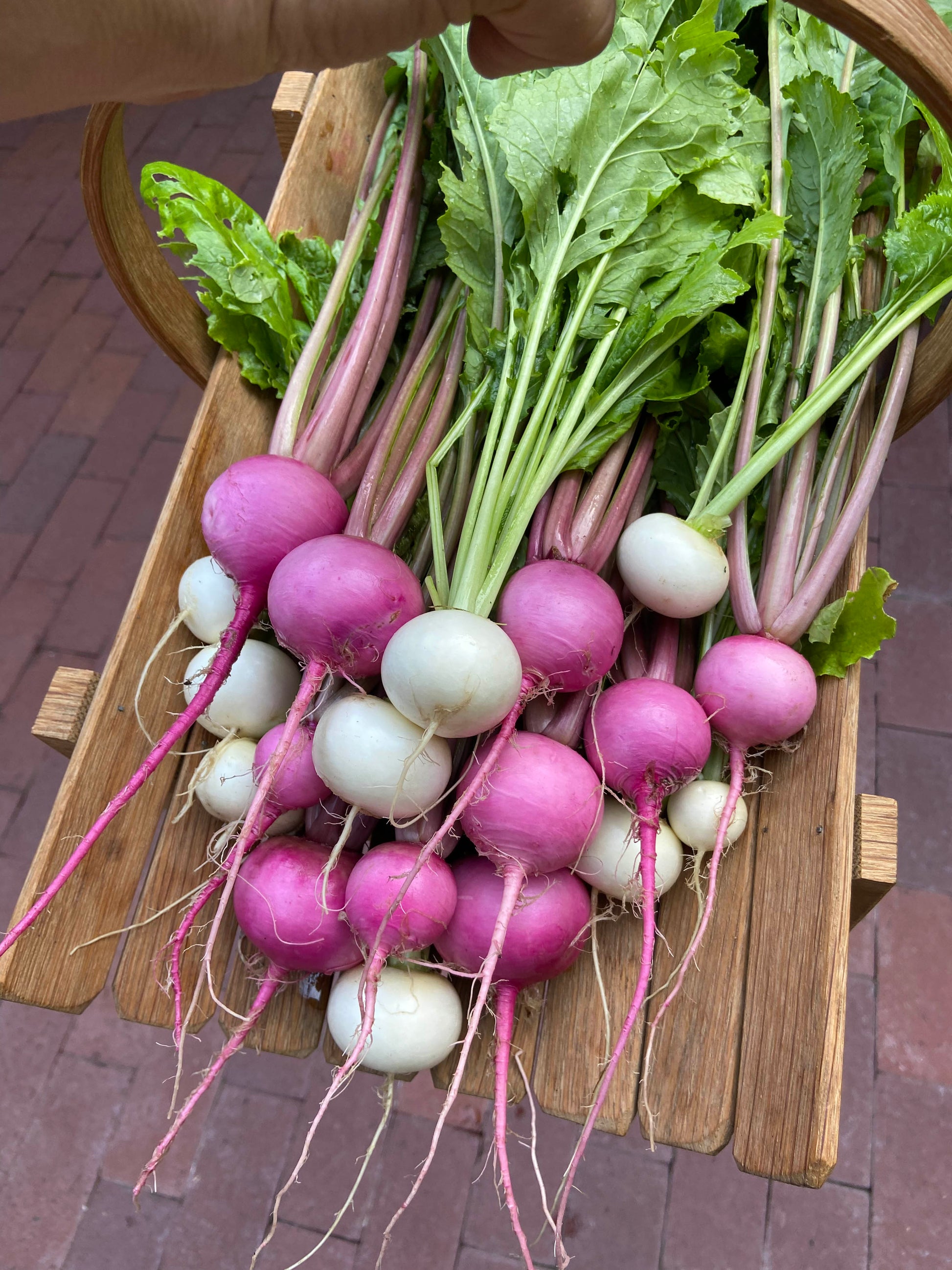 These pearly-white and pretty pink baby turnips are delicious sliced raw into green salads, or you can steam or sauté them briefly, or toss in oil and roast whole to bring out their natural sugars. Enjoy the tasty, nutritious green tops steamed or quickly braised.