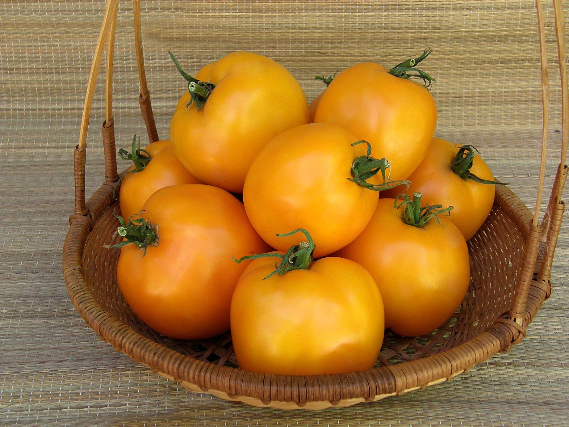 Heirloom producing intense glowing-orange, juicy slicing tomatoes, heavy for their size with mild, sweet flavor and creamy texture. The tall, sturdy vines produce heavy yields over a long season.