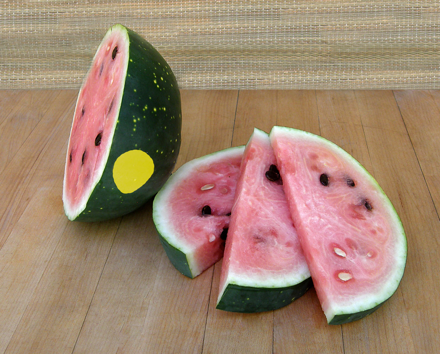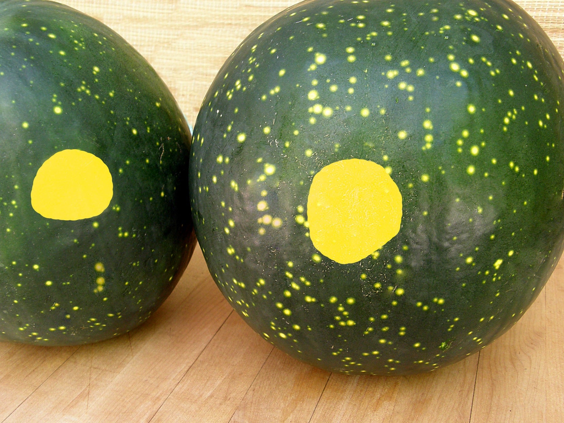 Wonderful heirloom whose big round to oval dark green fruits are overlaid with yellow moons on a field of tiny gold star markings. Leaves are also splashed with tiny stars. Juicy-sweet, pink flesh.