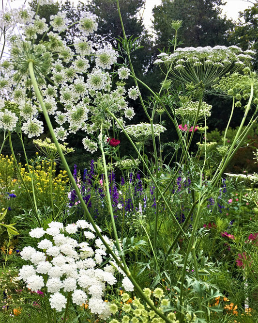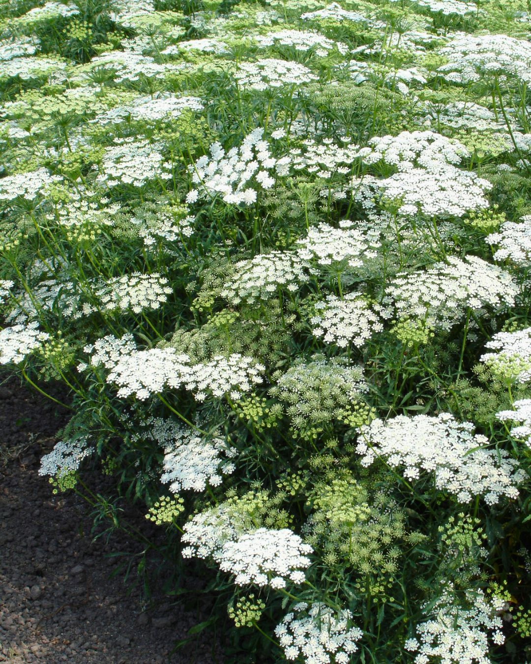Old-fashioned Bishop’s Lace flowers look like huge filigreed snowflakes floating above finely cut green foliage. Our superior 3 foot tall cut flower strain has more perfectly formed, snow white blossoms than the more familiar but somewhat weedy Queen Anne’s Lace. You’ll find the delicate frothy blossoms are perfect filler flowers for exquisite summer bouquets. Bishop Lace’s 4 to 5 inch intricate blossoms on graceful long stems add woodland charm to every garden.