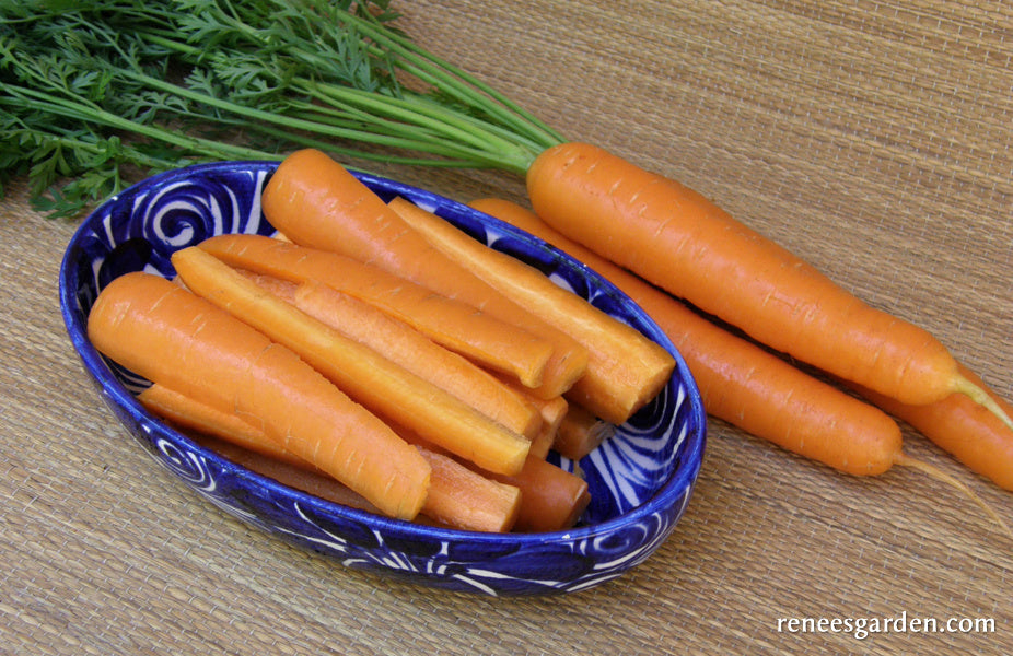 In spring once danger of hard frost is past, sow seeds in full sun in finely worked, fertile soil. Sow 1/4 inch deep and 1/2 inch apart in rows 8 inches apart, or broadcast thinly in beds and cover lightly. Keep seedbed evenly moist as carrots can be slow to germinate, emerging over 10 to 20 days. If first sowing comes up unevenly, replant right away as seedlings catch up quickly. Be sure to thin young carrots several times so seedlings are about 2 inches apart and have room to size up.