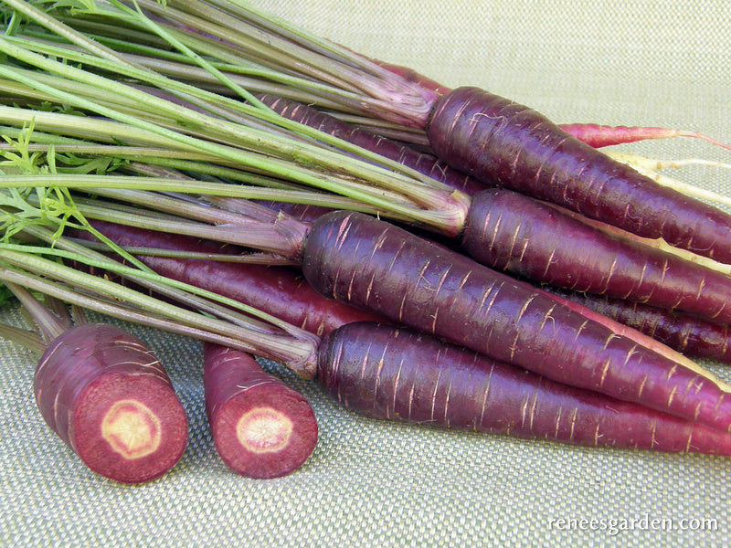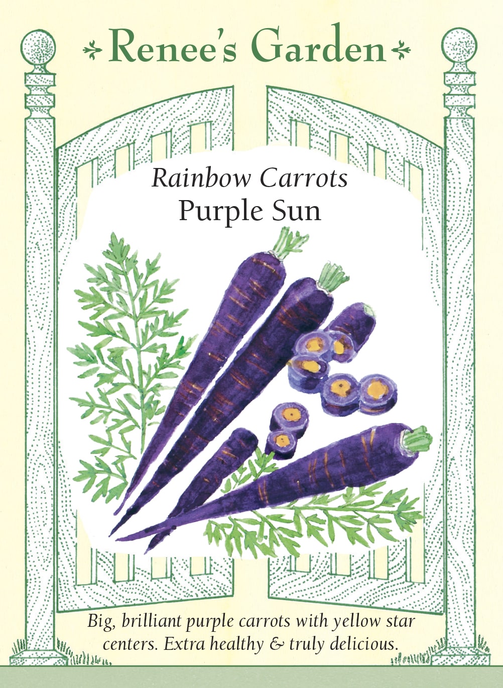 Whether you eat them raw or cooked, what we love about these great-looking, big dark purple carrots from Holland is that they grow vigorously and combine wonderful color, excellent sweet flavor and a crisp texture. These plump, conical carrots size up nicely and taper evenly from rounded shoulders to pointed tips. At the core is a little yellow sun. Purple Sun carrots are loaded with antioxidant flavonoids, so they taste great and offer real health benefits.