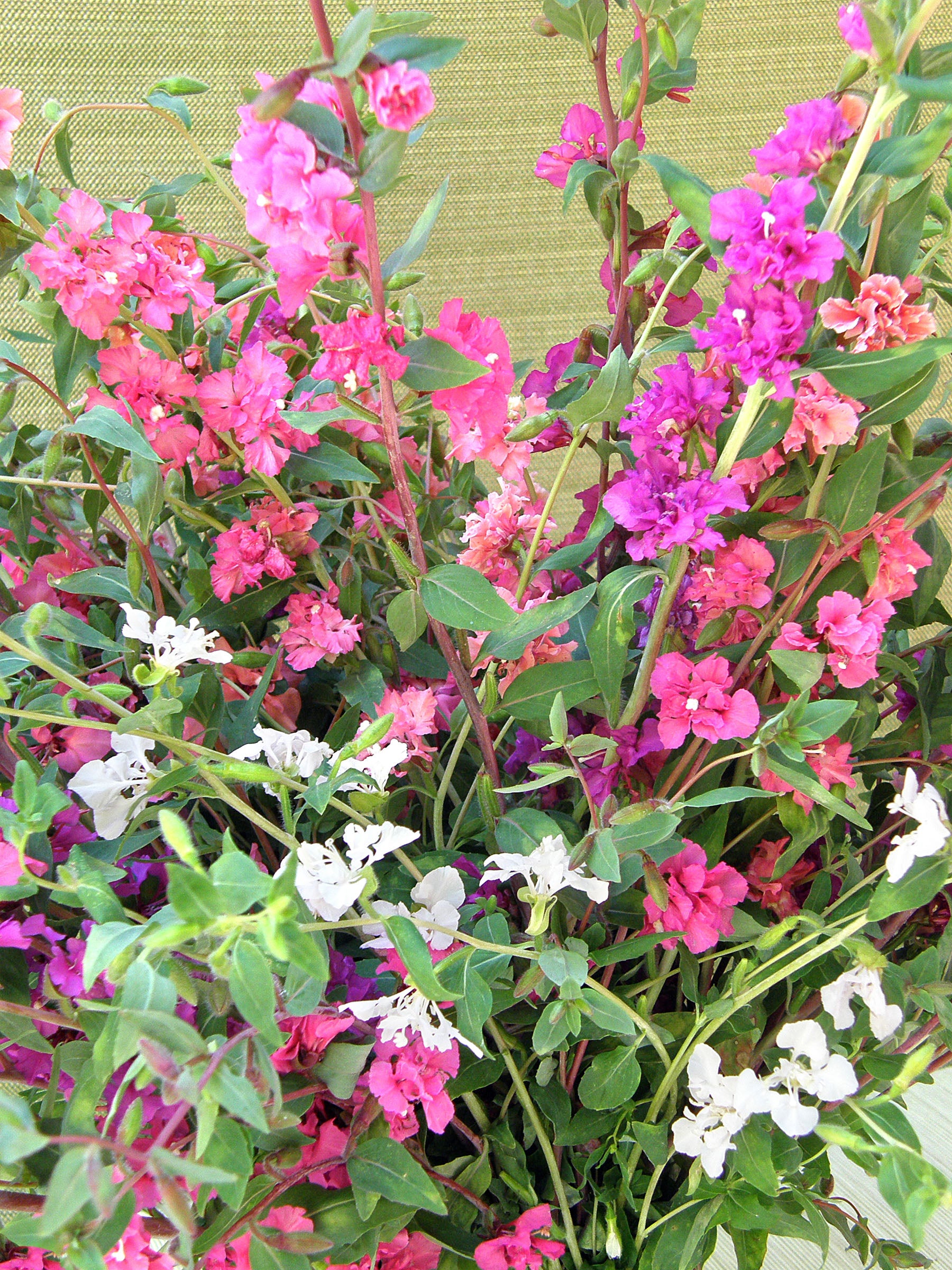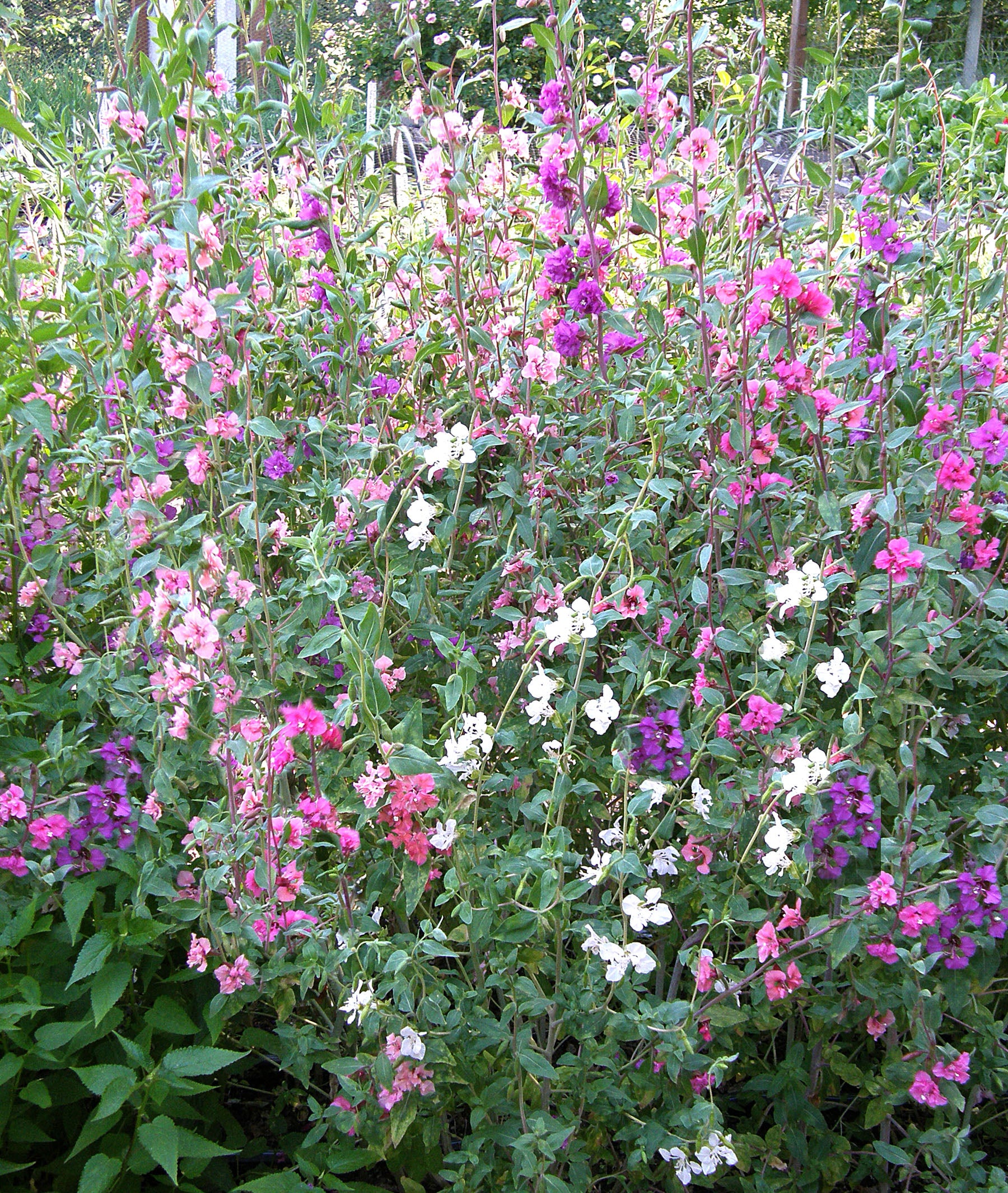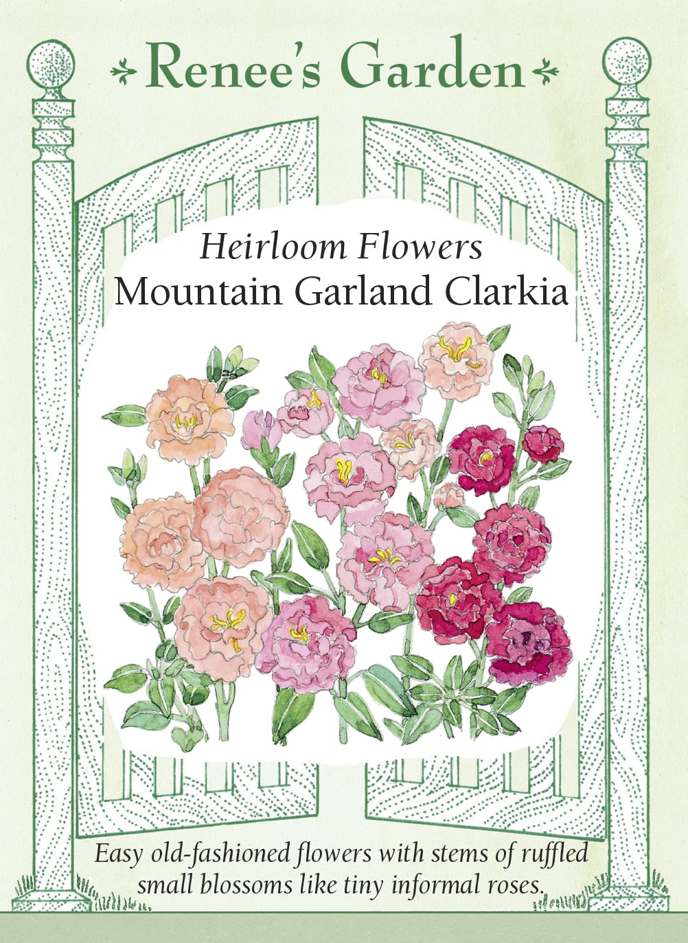 Native to California, easy growing Mountain Garland Clarkia is one of my favorite American wildflowers. The multiple flower stems are covered with ruffled ribbons of small blossoms, each shaped like tiny informal roses. These fluffy 2 to 3 foot tall wands of color fill the late spring garden in pretty soft shades of coral, salmon, rose-pink, lilac and pure white. Beautifully adapted to home gardens, the abundant graceful blooms are perfect for informal bouquets. Monet would have loved them in his Giverny gardens!