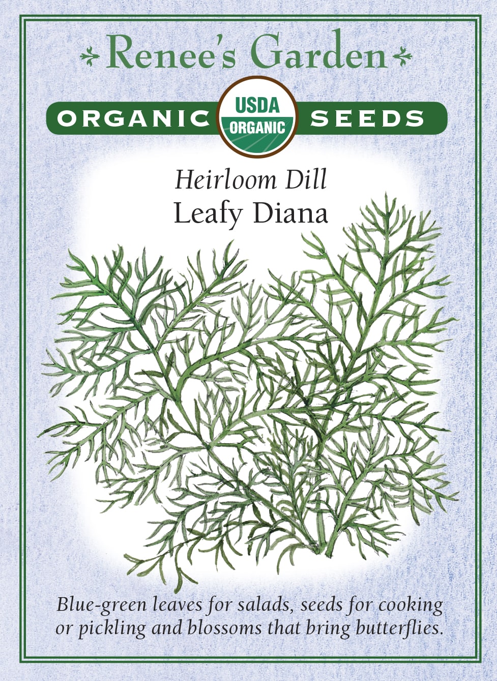 Heirloom dill's feathery blue-green leaves have a fine aromatic scent that is delicious in green salads, eggs & with potatoes or rice. Blossoms bring butterflies to the garden.