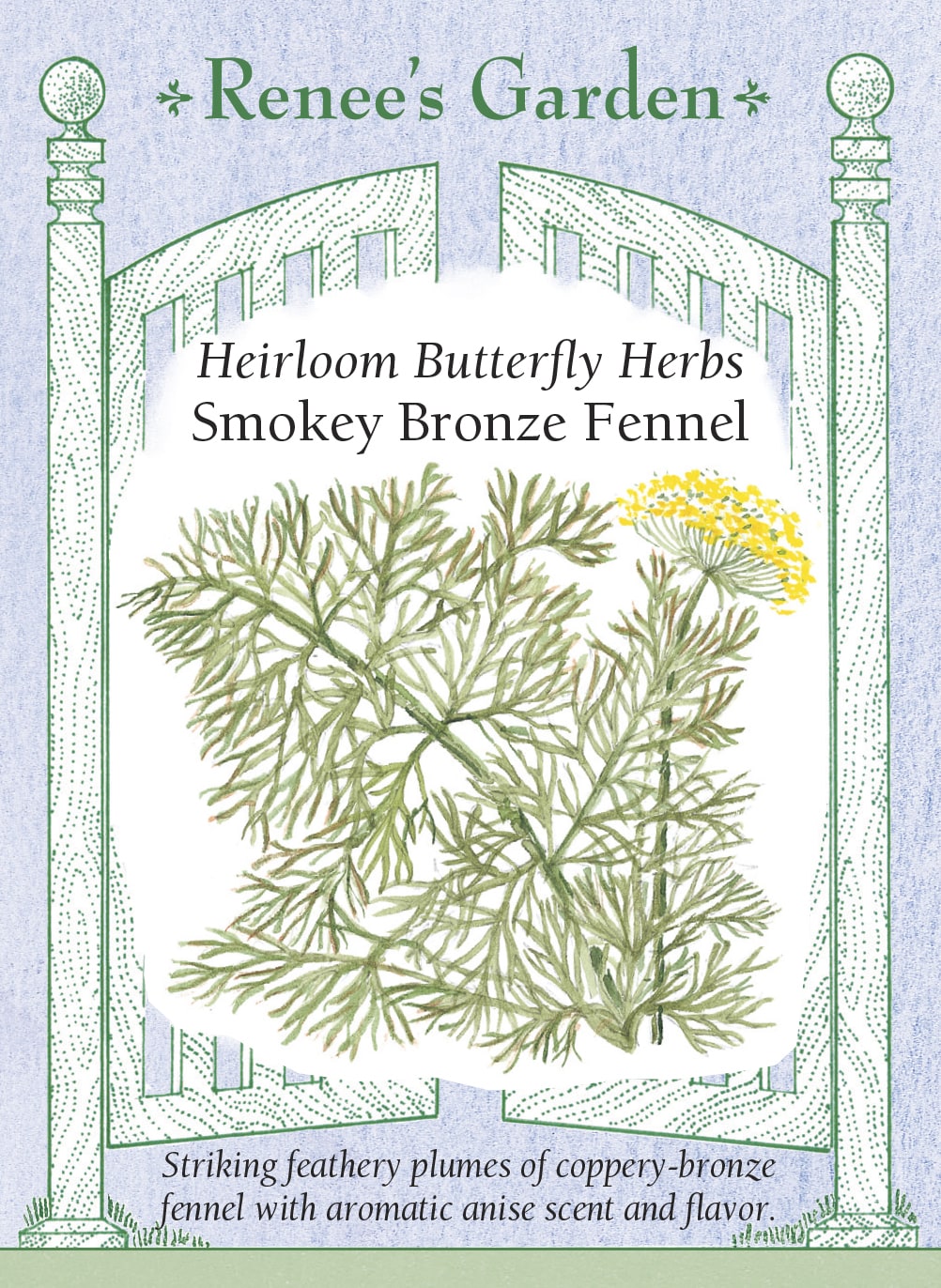 Striking 4 to 5 foot plumes of filigreed coppery leaves and lacy golden flower umbels that ripen mellow anise-flavored seeds. Smokey Bronze Fennel makes a stunning addition to flower or herb beds and is a major nectar & pollen host for many butterfly and beneficial insect species. Season seafood, salads or cooked vegetables with the feathery copper-bronze leaves. Tea made from the aromatic leaves or sweet seeds soothes upset stomachs and calms the nerves.
