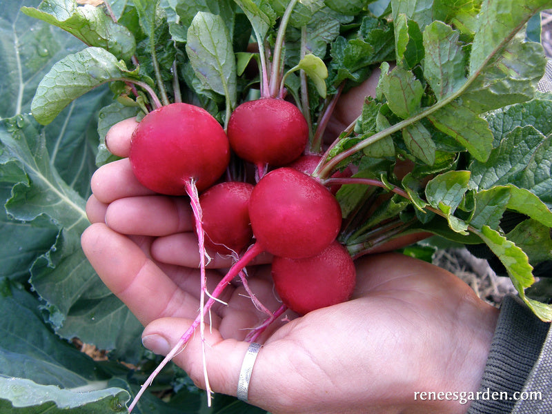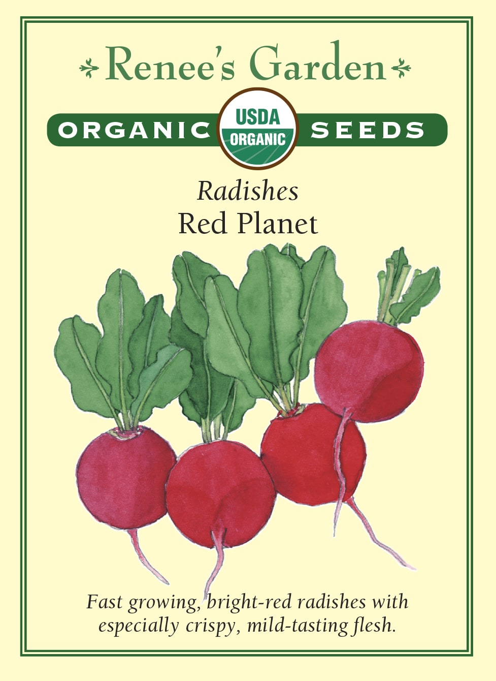 Sow this quick growing, cool season crop wherever you intend to plant heat lovers later. Radishes thrive and have crisp flesh and the best mild flavor given consistent moisture. Sow small amounts a week apart to ensure a constant supply. Thin quick-growing seedlings early to 2 inches apart so roots have room to size up. Protect radishes with floating row covers if marauding birds or flea beetles that chew holes in the leaves are a problem.