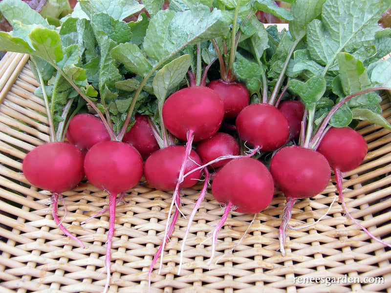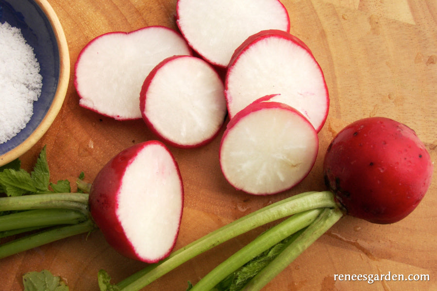 Harvest radishes when roots are the size of large marbles. If weather turns unexpectedly hot, pull, cut off tops, and store in the refrigerator for up to 3 weeks. Radishes will be spicier in hot weather and milder grown in cooler conditions. Combine sliced radishes, scallions and fresh dill or parsley for a great salad. Make delicious open faced sandwiches on whole grain bread spread with sweet butter and topped with sliced radishes.
