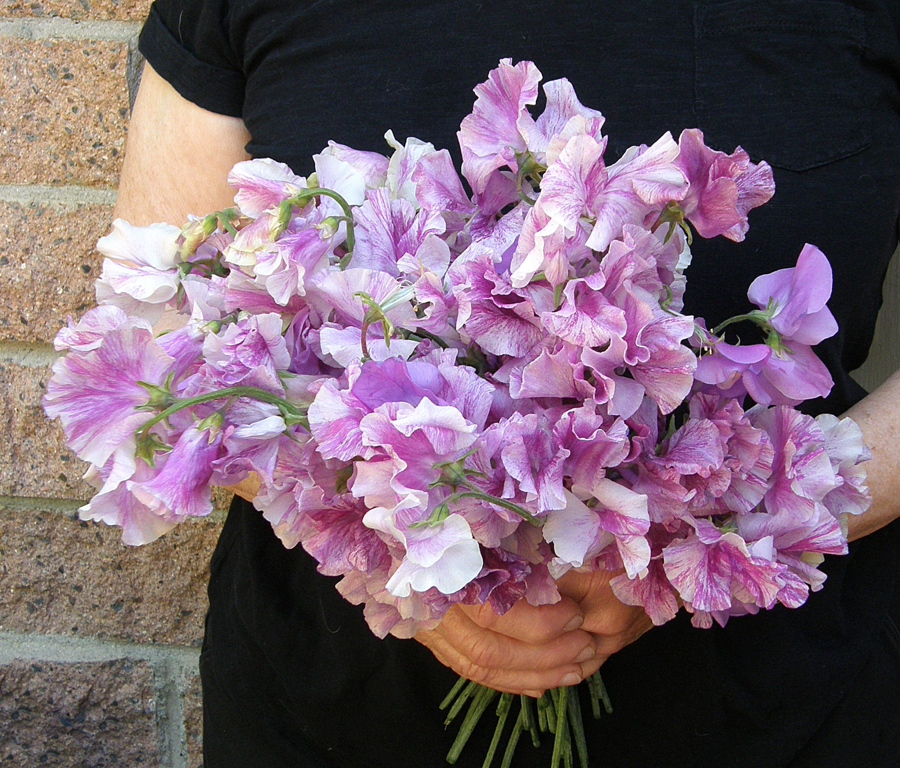 This enchanting old-fashioned Spencer type sweet pea offers long stems of lovely, softly ruffled big blossoms. The large wavy petals are a rich fresh cream color overlaid with markings in soft mauve/raspberry shades.