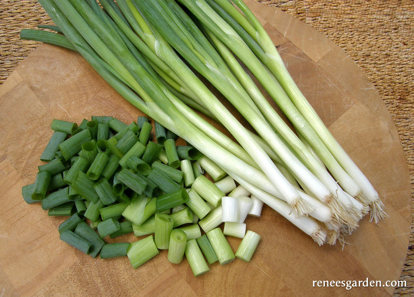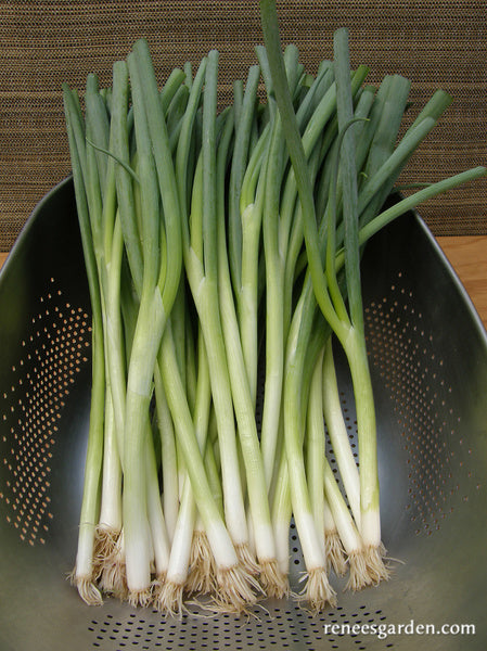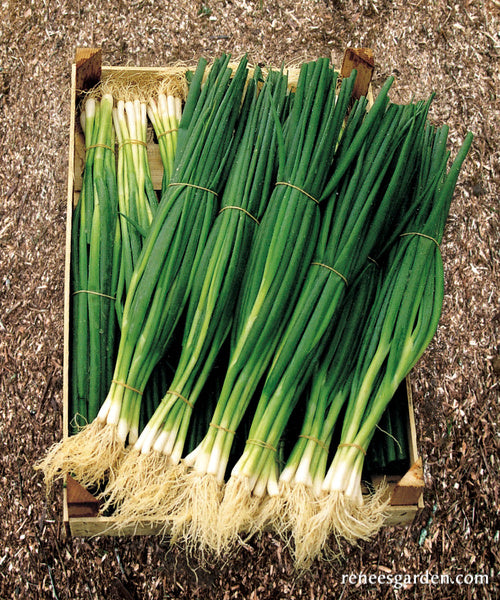 Strong-germinating, vigorous scallions (a.k.a. “green onions”), with snowy white flesh & deep green stalks. Especially tender texture. Their gentle onion flavor is a salad essential.