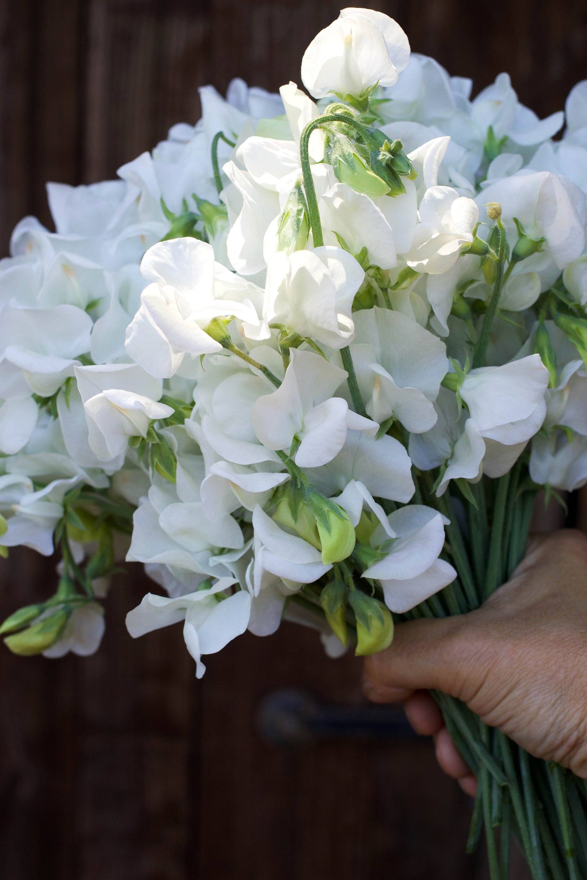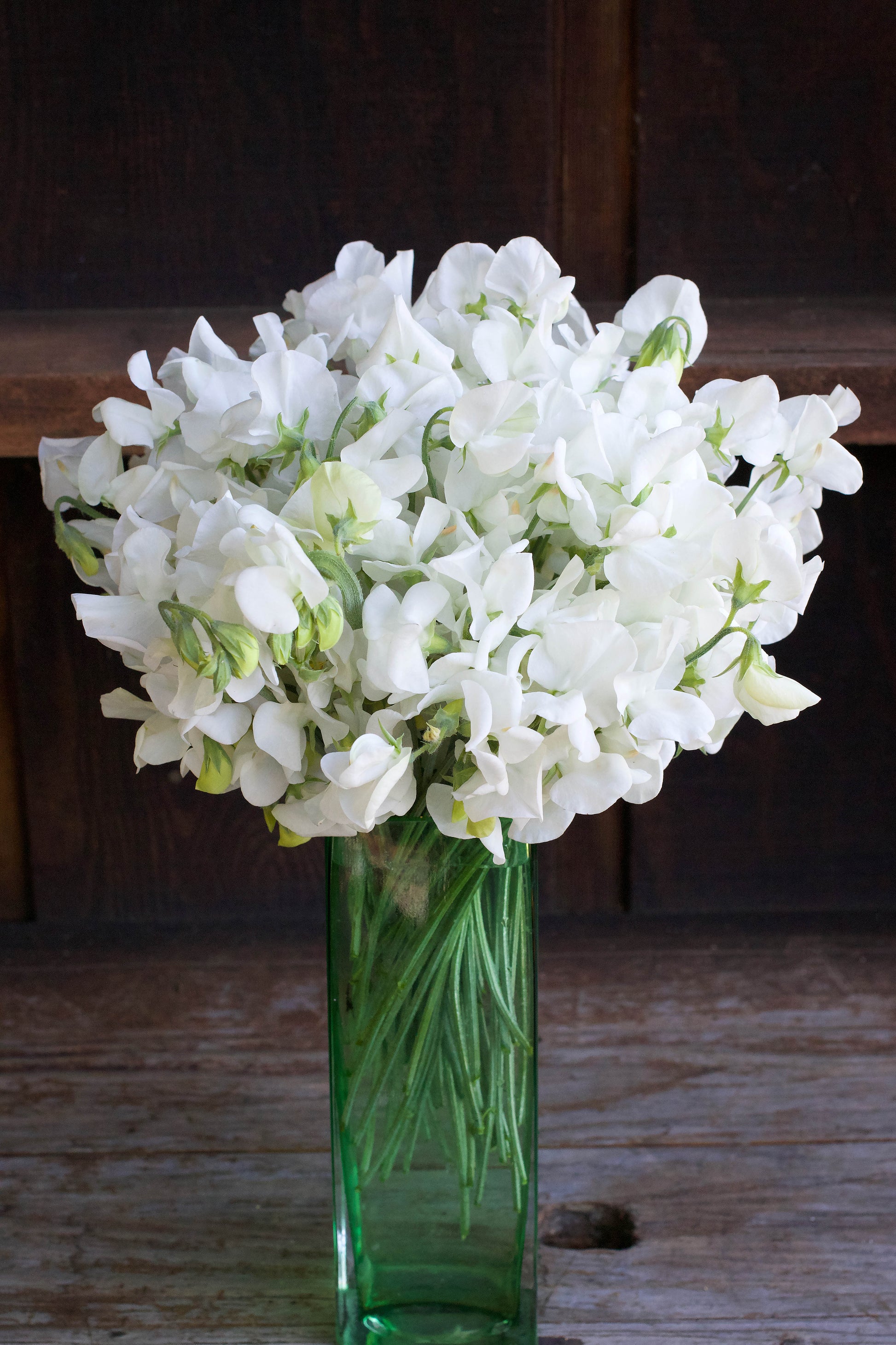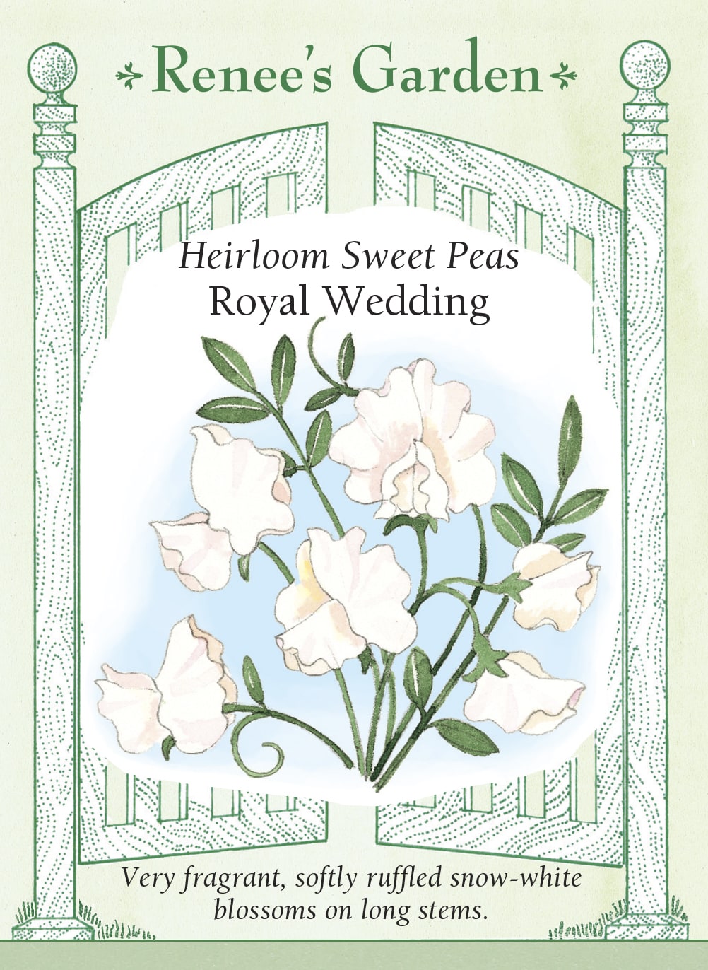 These long-stemmed, softly frilled sweet peas come down the garden aisle decked out in glorious pure white blossoms, four to six on each long stem, all with lovely ruffled petals. We import this premier award winning variety from England because it has outstanding form and garden performance and carries an enchanting fragrance reminiscent of jasmine and orange blossoms. You will enjoy Royal Wedding’s beauty and enticing perfume indoors and out over a long season of bloom.