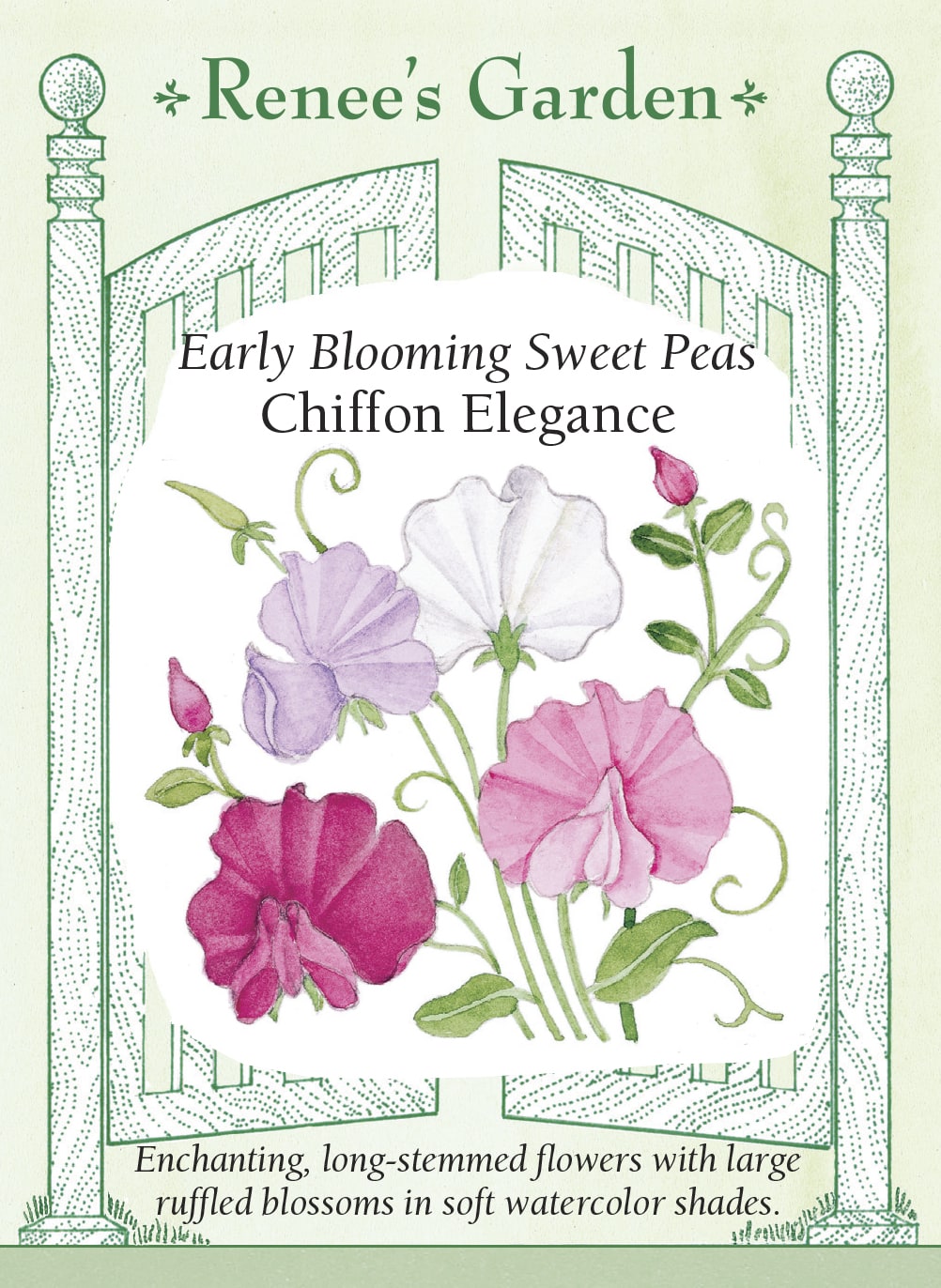 EXCLUSIVE - Day-length neutral Elegance sweet peas are specially bred to reliably bloom several weeks earlier than any other sweet pea. Our Chiffon Elegance is a silky watercolor quartet of softly colored blossoms in pure white, deepest magenta-rose, soft shell pink and gorgeous lavender. These large and beautifully formed ruffled flowers bloom on vigorous long stems for many weeks. The tall climbing vines produce a very long season of lightly fragrant enchanting blooms to enjoy in the garden and for endless lavish bouquets.