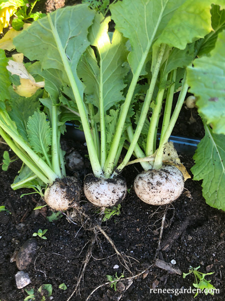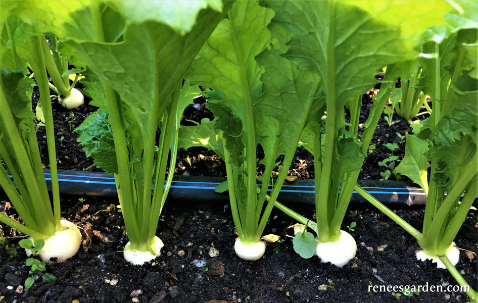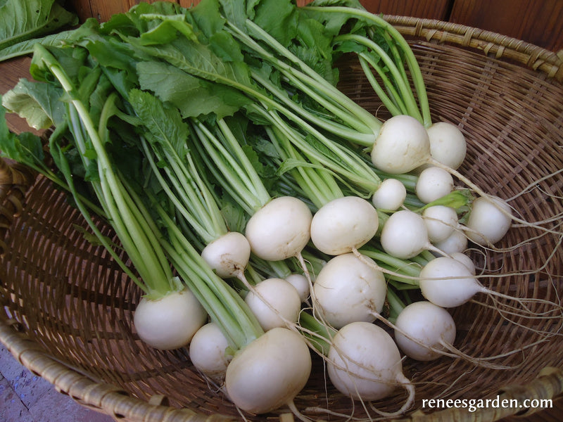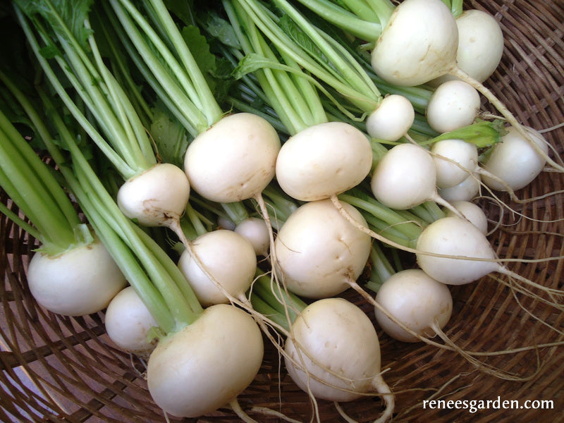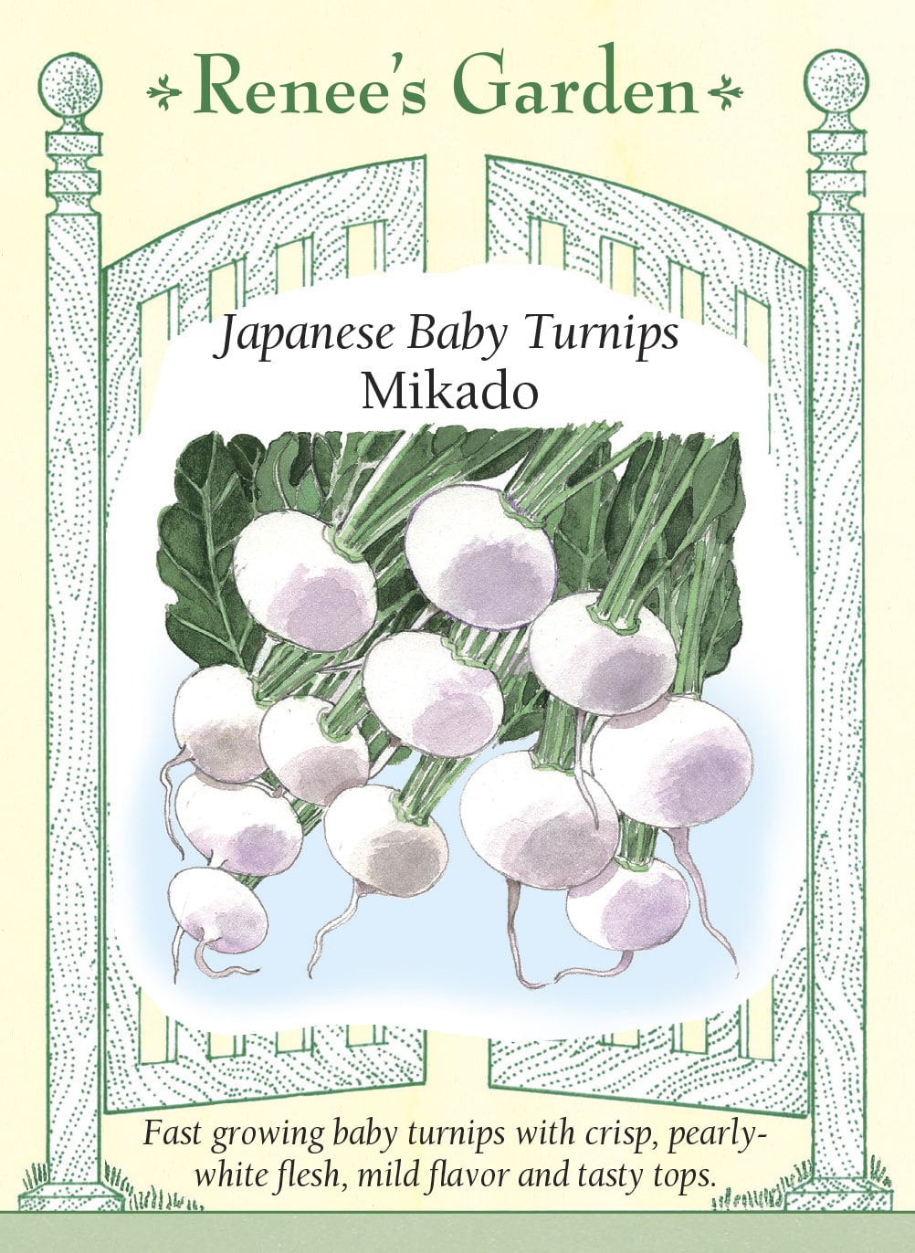 Sourced from Japan especially for us, these quick growing, pretty little globe-shaped roots have crisp, pearly-white flesh. Enjoy their mild flavor sliced up raw for green salads and crunchy snacks or quickly stirfry, sauté or roast them whole in the oven – they cook in minutes. Mikado’s tasty and nutritious tops make fine cooked greens. These baby turnips are a spring garden treasure that you can happily sow again in late summer for abundant fall harvests.