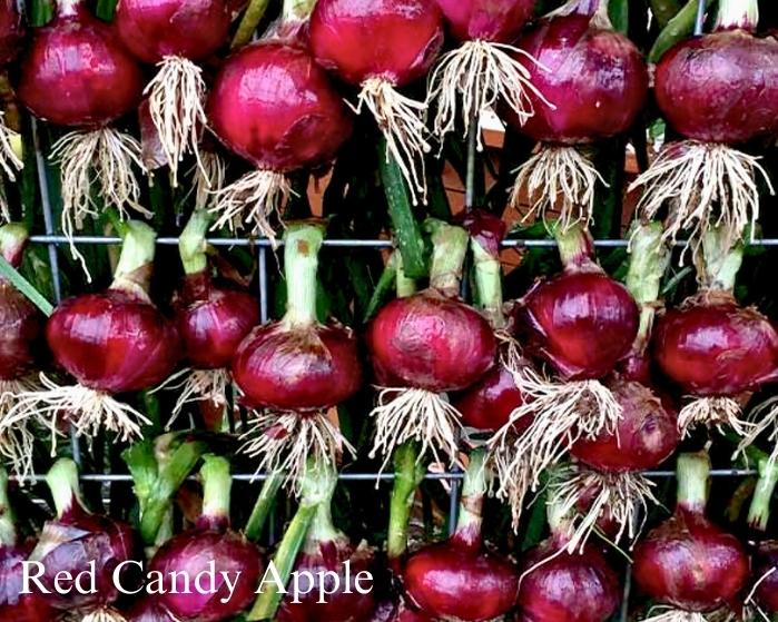 These beautiful globe-shaped hybrid red onions, aptly named Red Candy Apple, form slightly flattened 3 in. bulbs with absolutely glowing magenta-red skins and sweet, slightly pungent flesh. When planted in short and intermediate day areas it produces larger bulbs. It will not size to jumbo onions in long day areas.
