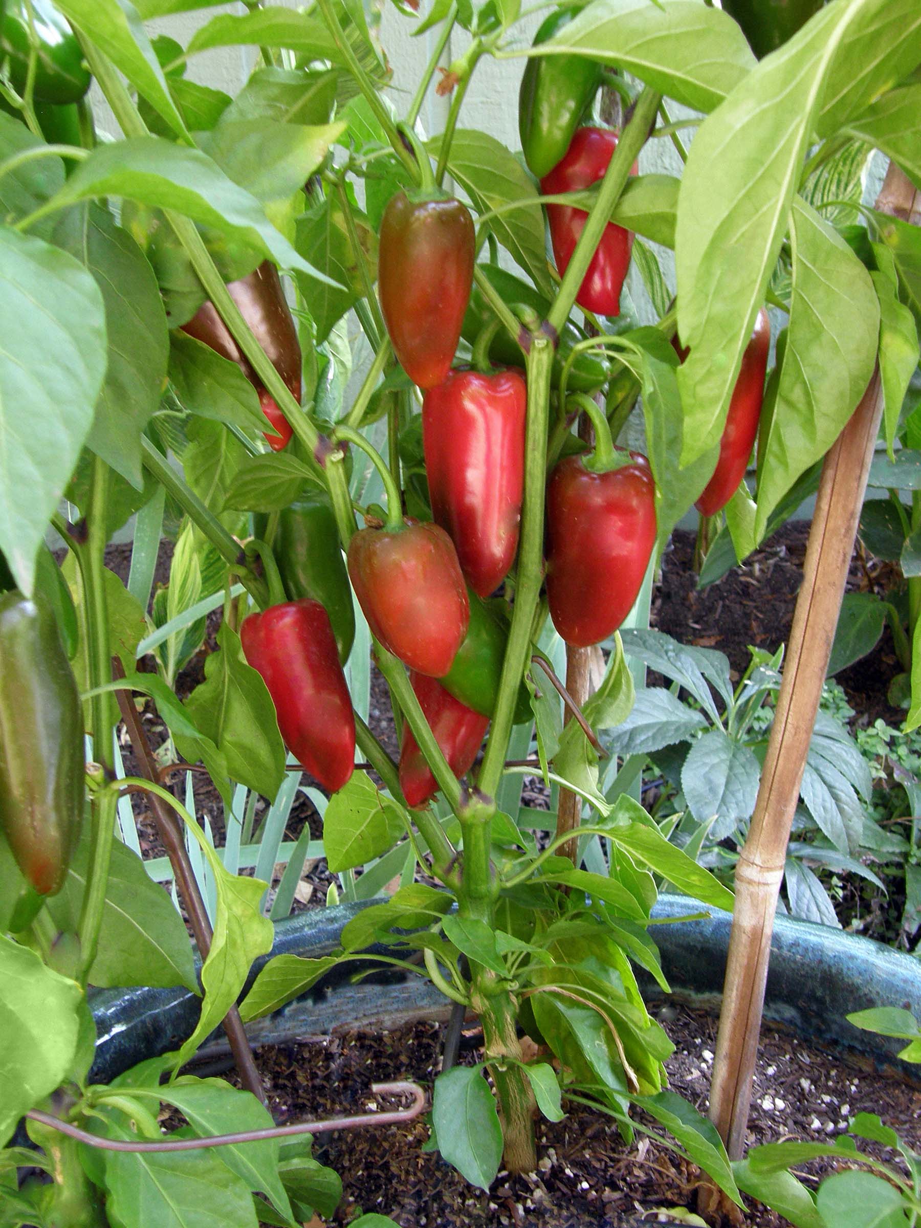 Peppers need full sun at least 6 hours per day. Mulch well to maintain even moisture. Provide short stakes or cages to support heavy sets of ripening fruit. Check containers often and water regularly; when plants begin setting fruit they may require daily watering.