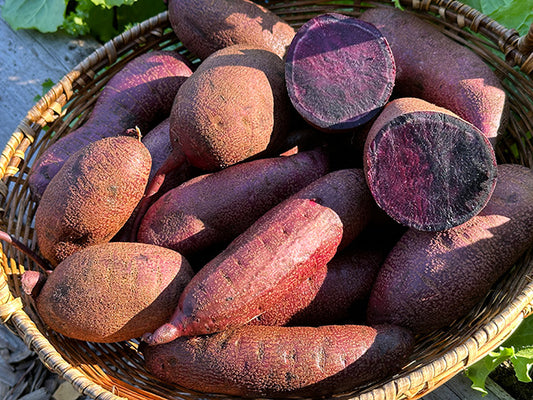 Purple Majesty has dry sweet flesh and is great simply roasted or baked. It performs well in both hot and cooler season areas, producing good yields of colorful, tasty tubers that are also well adapted to sandy soils. This fine variety was bred at NCSU and is resistant to Fusarium wilt.