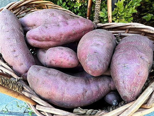 Red Japanese sweet potatoes, also known as Murasake, have dark red skin and pale yellow to white sweet flesh. They have a lower moisture content than other varieties, giving them a light and fluffy consistency and are known for their distinctive chestnut-like nutty sweet flavor.