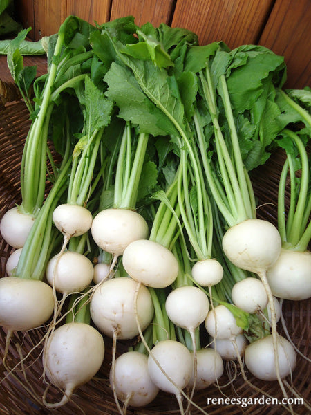 Sourced from Japan especially for us, these quick growing, pretty little globe-shaped roots have crisp, pearly-white flesh. Enjoy their mild flavor sliced up raw for green salads and crunchy snacks or quickly stirfry, sauté or roast them whole in the oven – they cook in minutes. Mikado’s tasty and nutritious tops make fine cooked greens. These baby turnips are a spring garden treasure that you can happily sow again in late summer for abundant fall harvests.