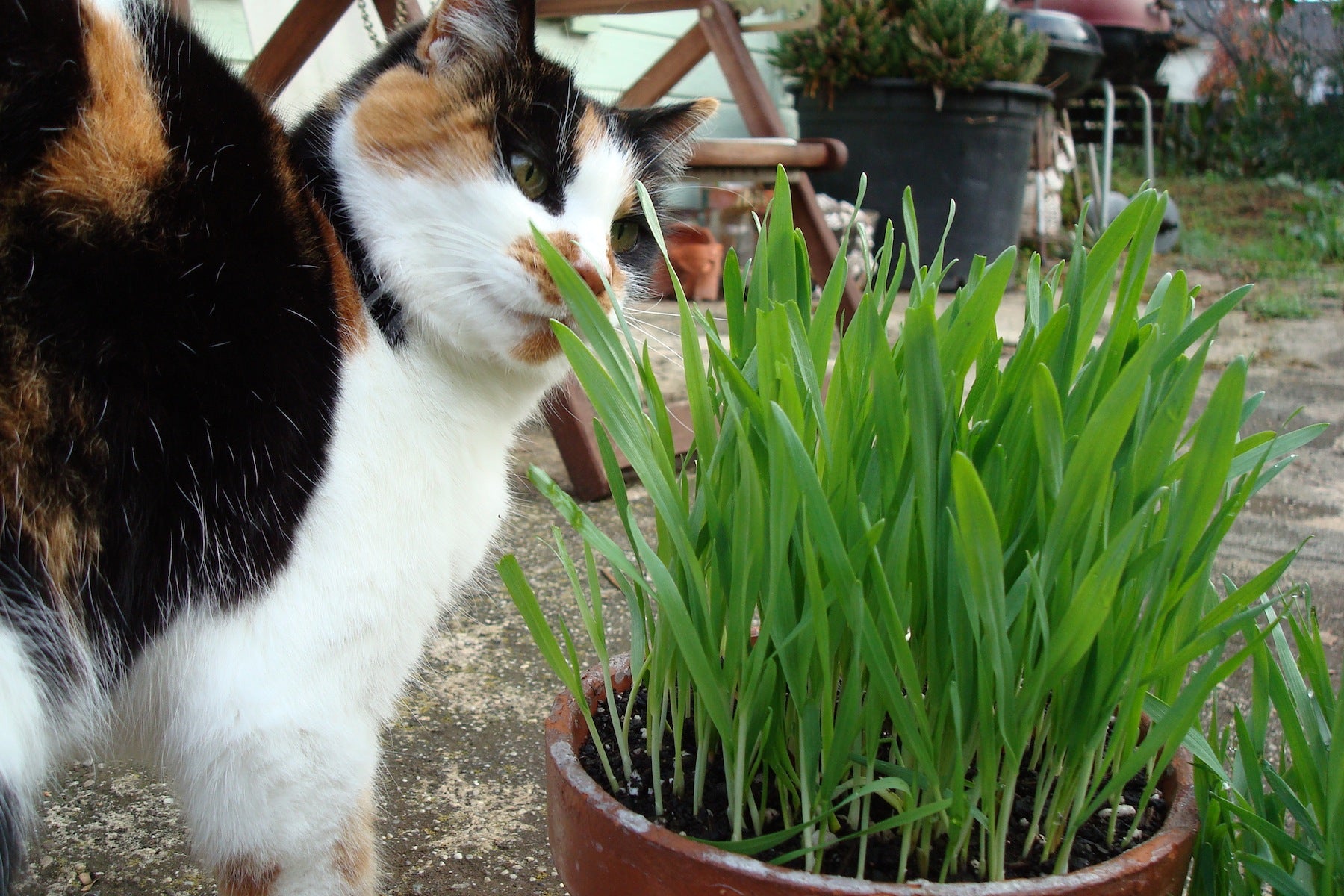 Most cats will recognize the grass as a treat right away. To encourage finicky eaters, place the pot beside the kitty’s food and spritz it with water. This usually does the trick.