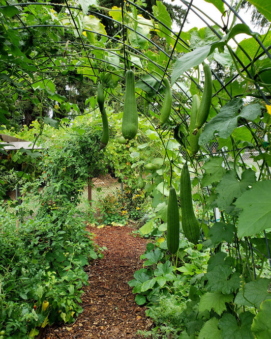 Loofahs are members of the gourd family, originally from China. These handsome trailing vines can be grown on a fence or trellis or allowed to ramble at garden edges. Growing loofahs look like wrinkly big cucumbers. At seasons end, when dry and mature, the rinds are simply peeled, revealing their sponge-like fibrous interior. Loofahs make marvelous skin scrubbers for stimulating circulation and improving skin tone in the bath or shower. Home grown Loofahs make wonderful holiday gifts!