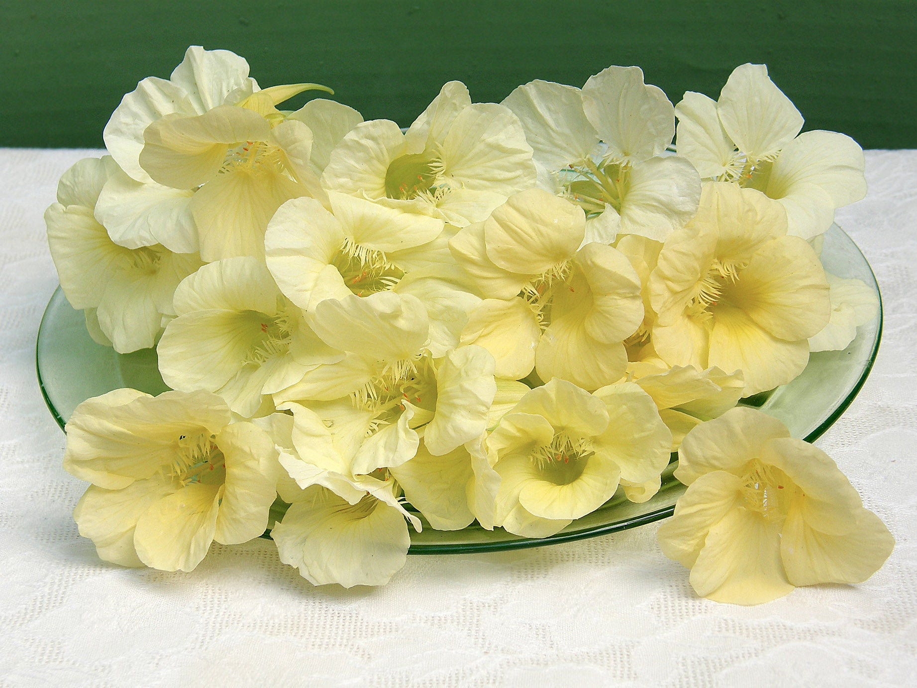 These mounding nasturtiums are reliable and easy to tuck into any well-drained spot. They are a perfect disguise to cover fading bulb foliage in late spring. Their softly draping leaves and creamy flowers will quickly fill garden beds or containers. In mild winter climates, sow seeds again by mid-June for late summer blooms. Leaves and flowers are tasty additions to salads and sandwiches.