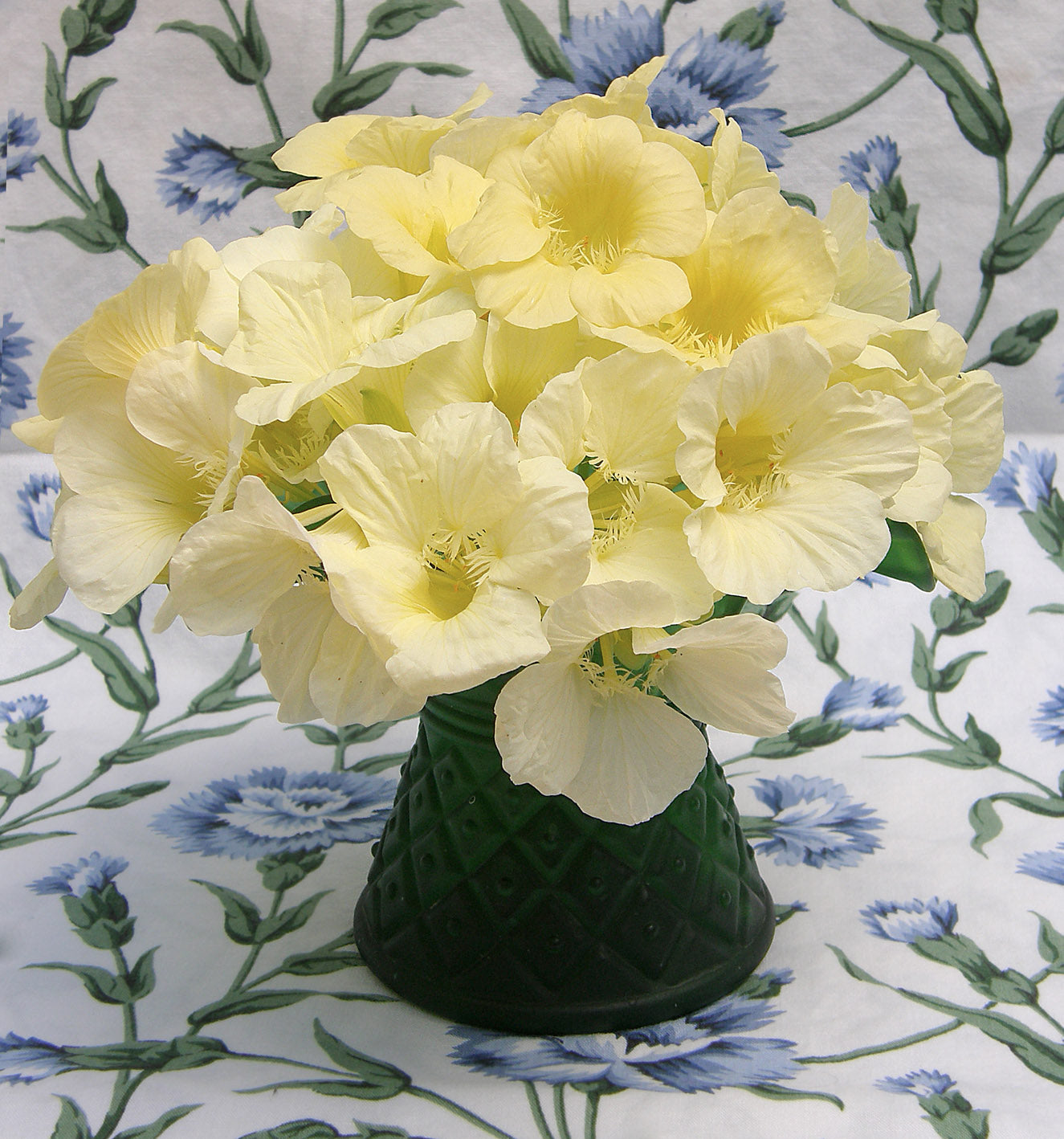 The lovely semi-double blossoms of this tropical-looking pastel variety seem to float over the pretty rounded green leaves that remind us of water lilies. Buttercream nasturtiums grow into a softly mounding form that drapes gracefully to fill in garden beds and borders. They are especially lush looking in window boxes and containers. The abundant creamy blossoms and deep green leaves make tasty edible garnishes. A customer favorite for many decades.