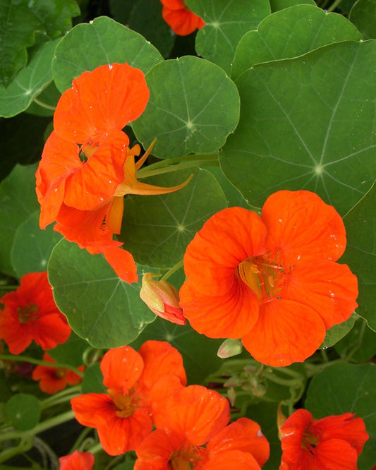 Climbing nasturtiums are easy to grow in any well-drained soil. You’ll need to train young plants onto their supports with loose ties, then they’ll climb easily and bloom non-stop. Do not let plants dry out during blooming season. Spitfire’s glowing blossoms are summer beacons for hungry hummingbirds.